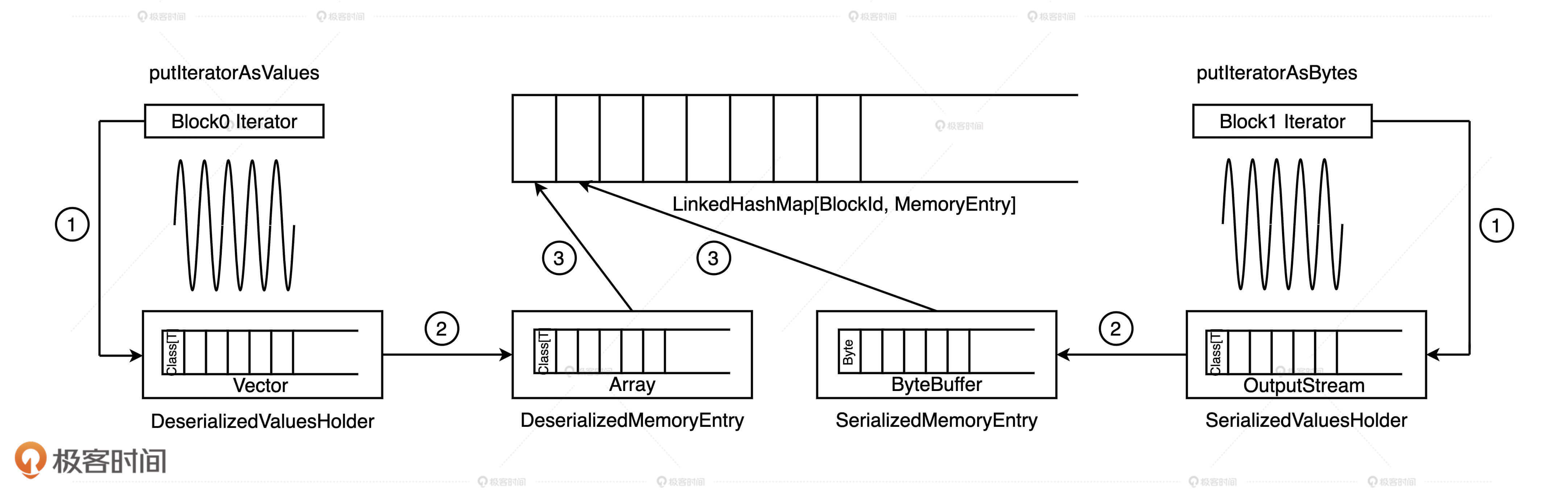 **第二步,为了节省内存开销,我们可以在存储数据值的ValuesHolder上直接调用toArray或是toByteBuffer操作,把ValuesHolder转换为MemoryEntry数据结构。**注意啦,这一步的转换不涉及内存拷贝,也不产生额外的内存开销,因此Spark官方把这一步叫做“从Unroll memory到Storage memory的Transfer(转移)”。