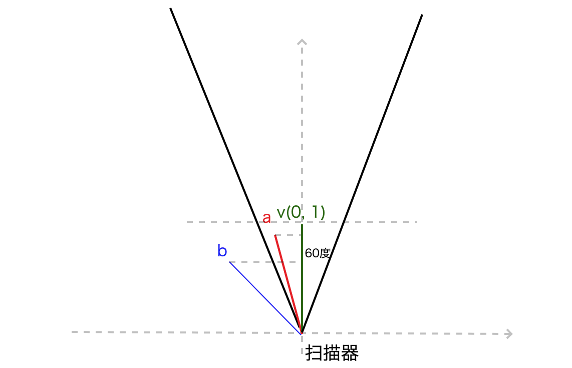 - 点不在扫描范围内,如向量b,就一定满足:|b X v| > ||b||v|sin(30°)| = |sin(30°)| = 0.5。