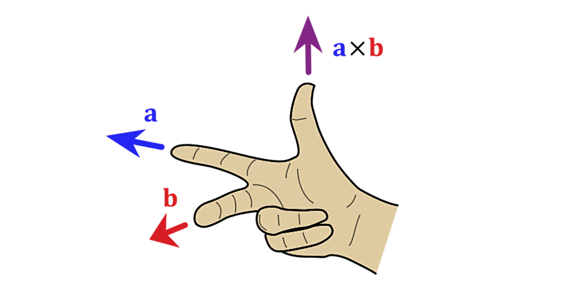 还记得吗?第2节课我们提到过左手系和右手系,其中x轴向右、y轴向下的坐标系是右手系。在右手系中求向量a、b叉积的方向时,我们可以把右手食指的方向朝向a,把右手中指的方向朝向b,那么大拇指所指的方向就是a、b叉积的方向,这个方向是垂直纸面向外(即朝向我们)。因此,右手系中向量叉乘的方向就是右手拇指的方向,那左手系中向量叉乘的方向自然就是左手拇指的方向了。