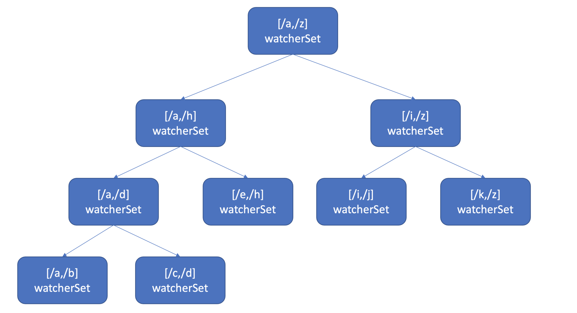 也许你会说使用map记录下哪些watcher监听了什么key不就可以了吗? etcd的确使用map记录了监听单个key的watcher,但是你要注意的是Watch特性不仅仅可以监听单key,它还可以指定监听key范围、key前缀,因此etcd还使用了如下的区间树。