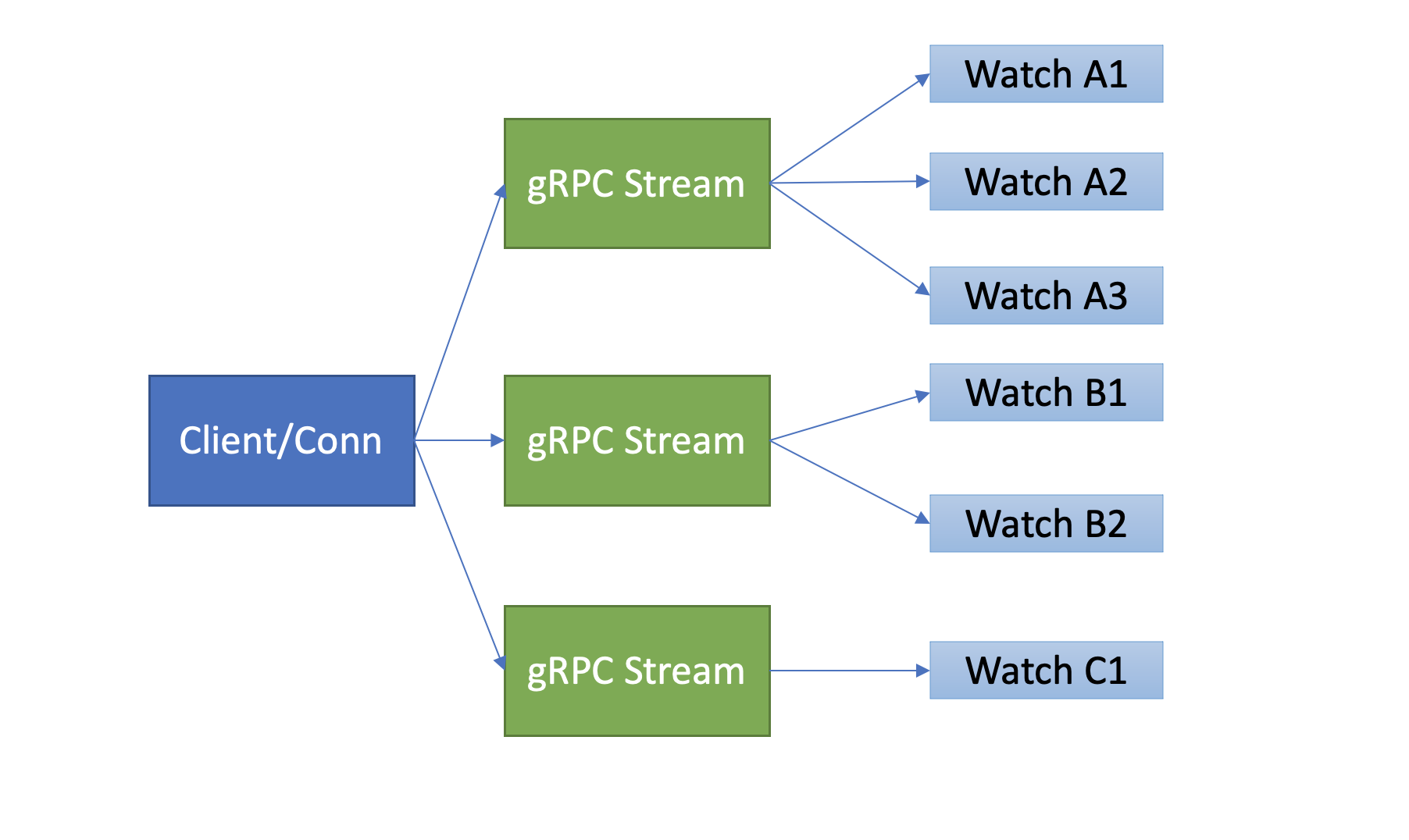 etcd基于以上介绍的HTTP/2协议的多路复用等机制,实现了一个client/TCP连接支持多gRPC Stream, 一个gRPC Stream又支持多个watcher,如下图所示。同时事件通知模式也从client轮询优化成server流式推送,极大降低了server端socket、内存等资源。