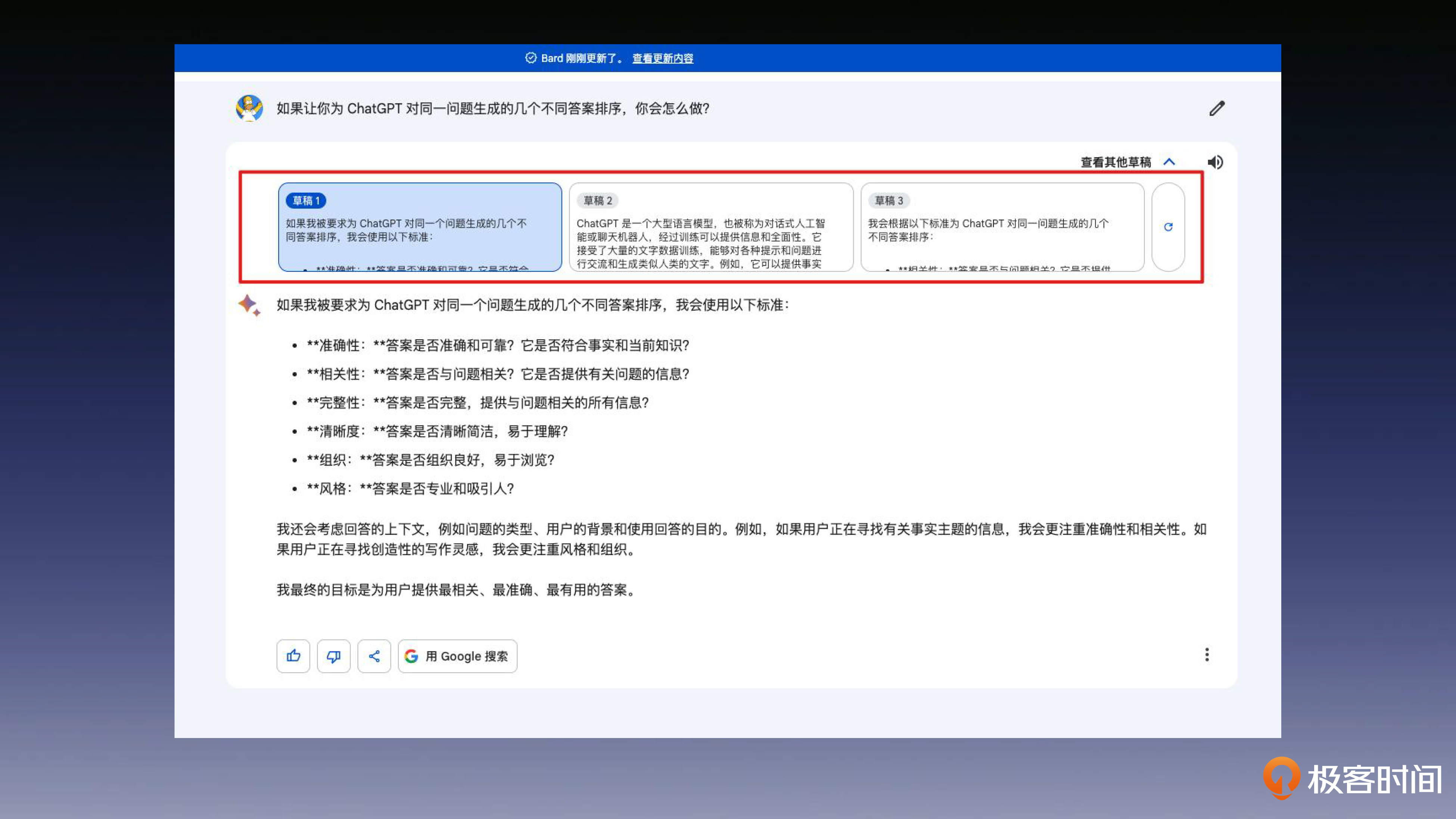 我们知道 Bard 是支持给出多个草稿并展示最优结果的,如果让你为 ChatGPT 对同一问题生成的几个不同答案排序,你会怎么做?