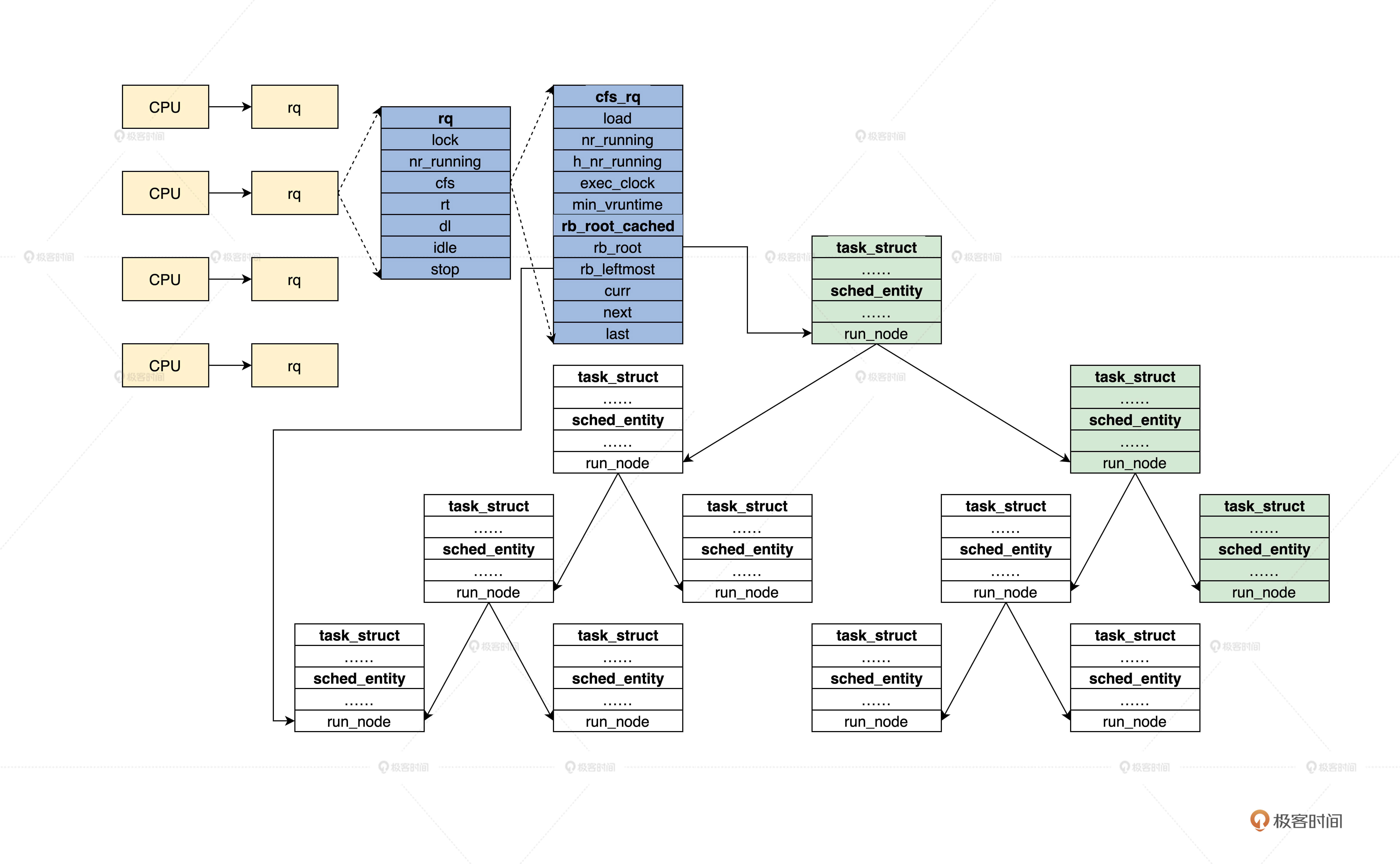 通过前面的学习,我们已经了解了rq、cfs_rq、rb_root_cached、sched_entity、task_struct等数据结构,下面我们来看看它的组织关系,我特意为你准备了后面这幅图。
