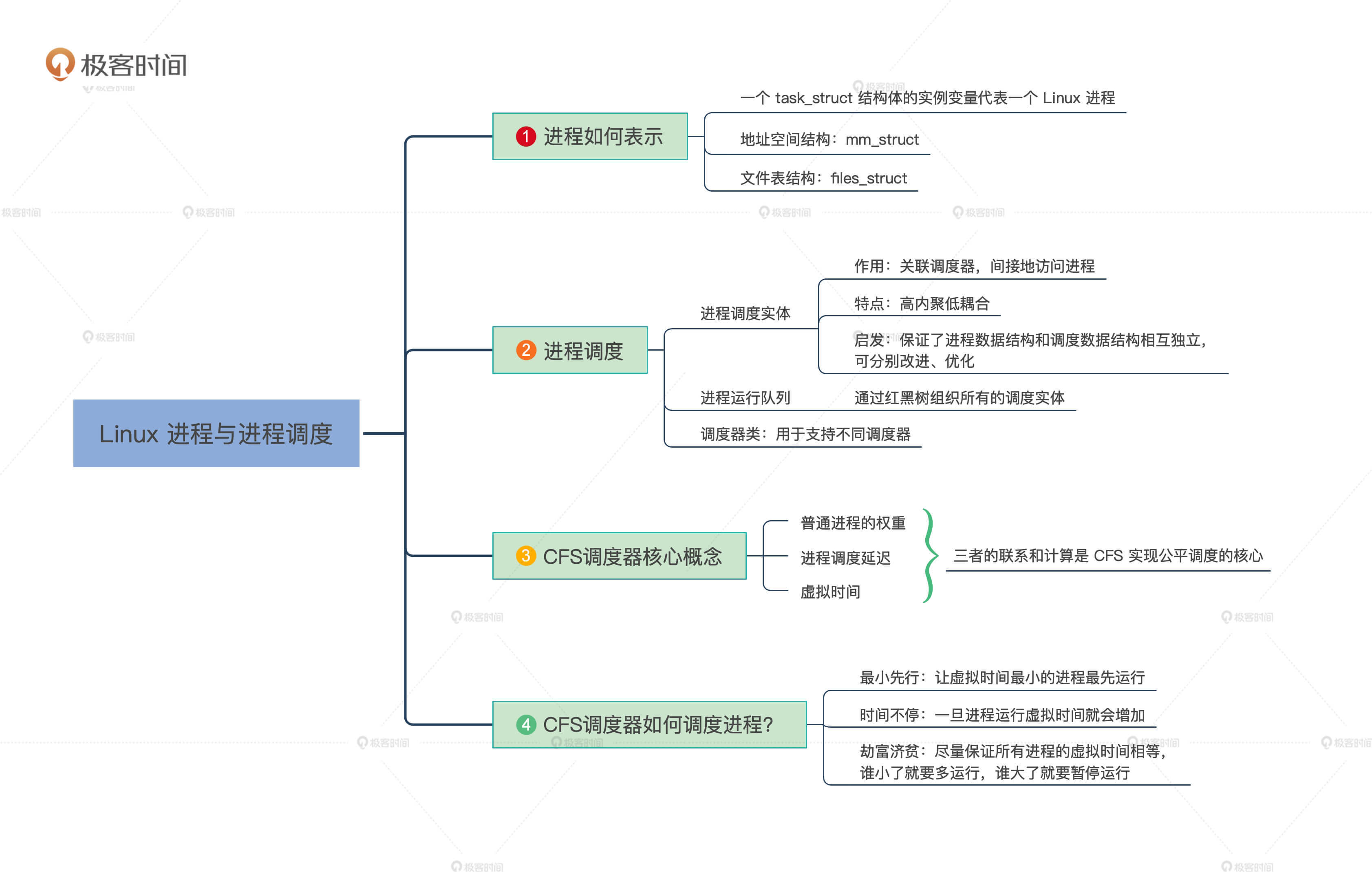 为了帮你掌握核心思路,关于task_struct结构体,我省略了进程的权能、性能跟踪、信号、numa、cgroup等相关的近500行内容,你若有兴趣可以自行阅读,这里你只需要明白,在内存中,一个task_struct结构体的实例变量代表一个Linux进程就行了。