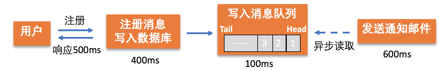 假设,系统将注册信息写入数据库需要花费400ms、给用户发送通知邮件需要花费600ms。