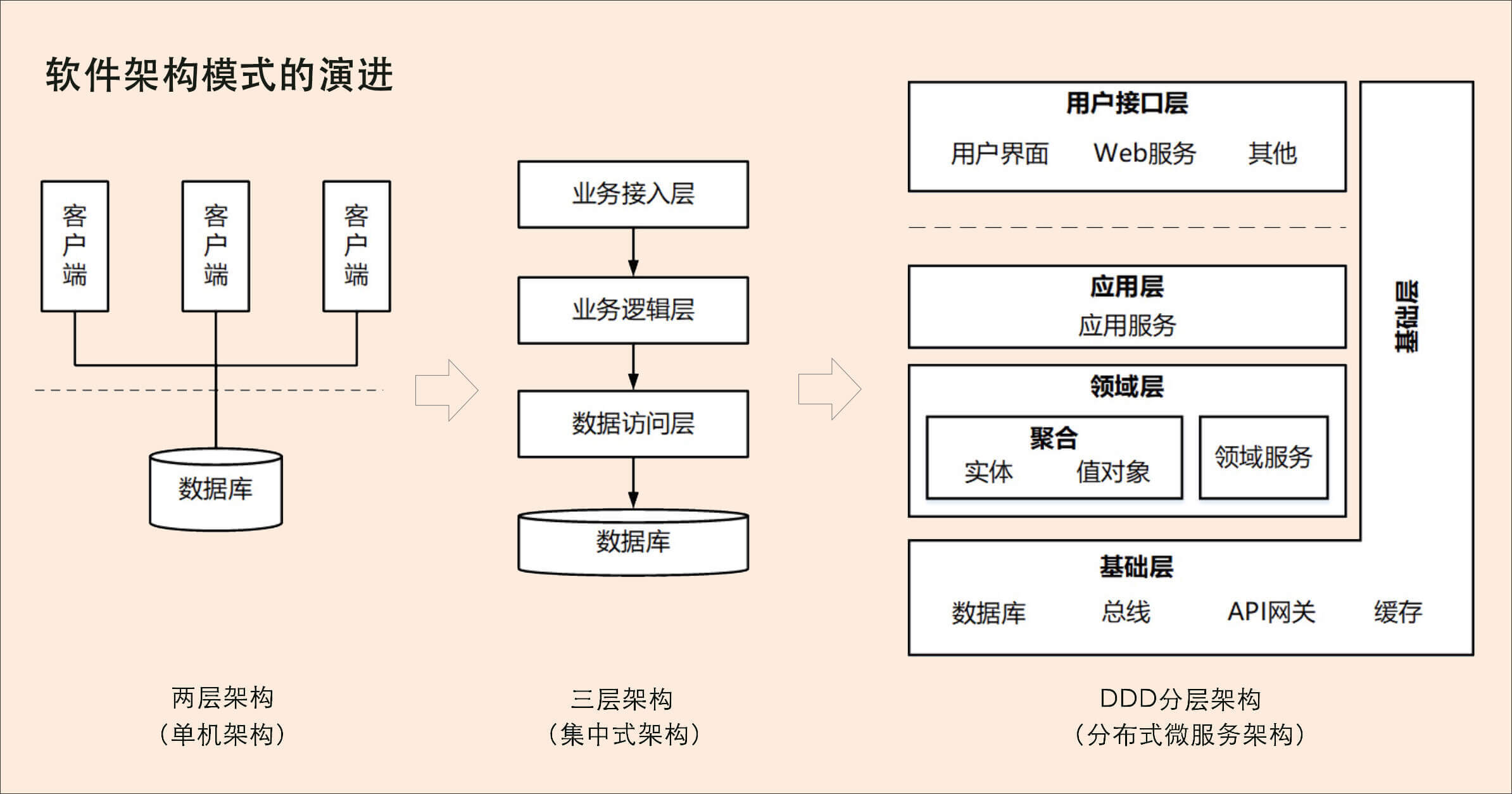 我们知道,这些年来随着设备和新技术的发展,软件的架构模式发生了很大的变化。软件架构模式大体来说经历了从单机、集中式到分布式微服务架构三个阶段的演进。随着分布式技术的快速兴起,我们已经进入到了微服务架构时代。