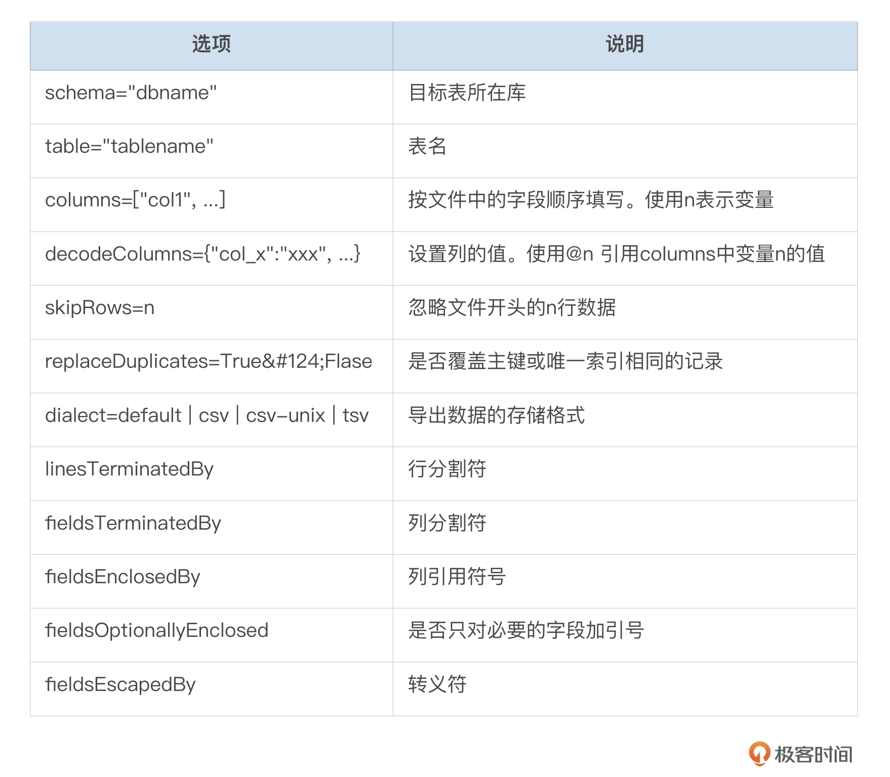 import_table选项 我整理了import_table支持的部分选项,供你参考。完整的选项请参考官方文档 。