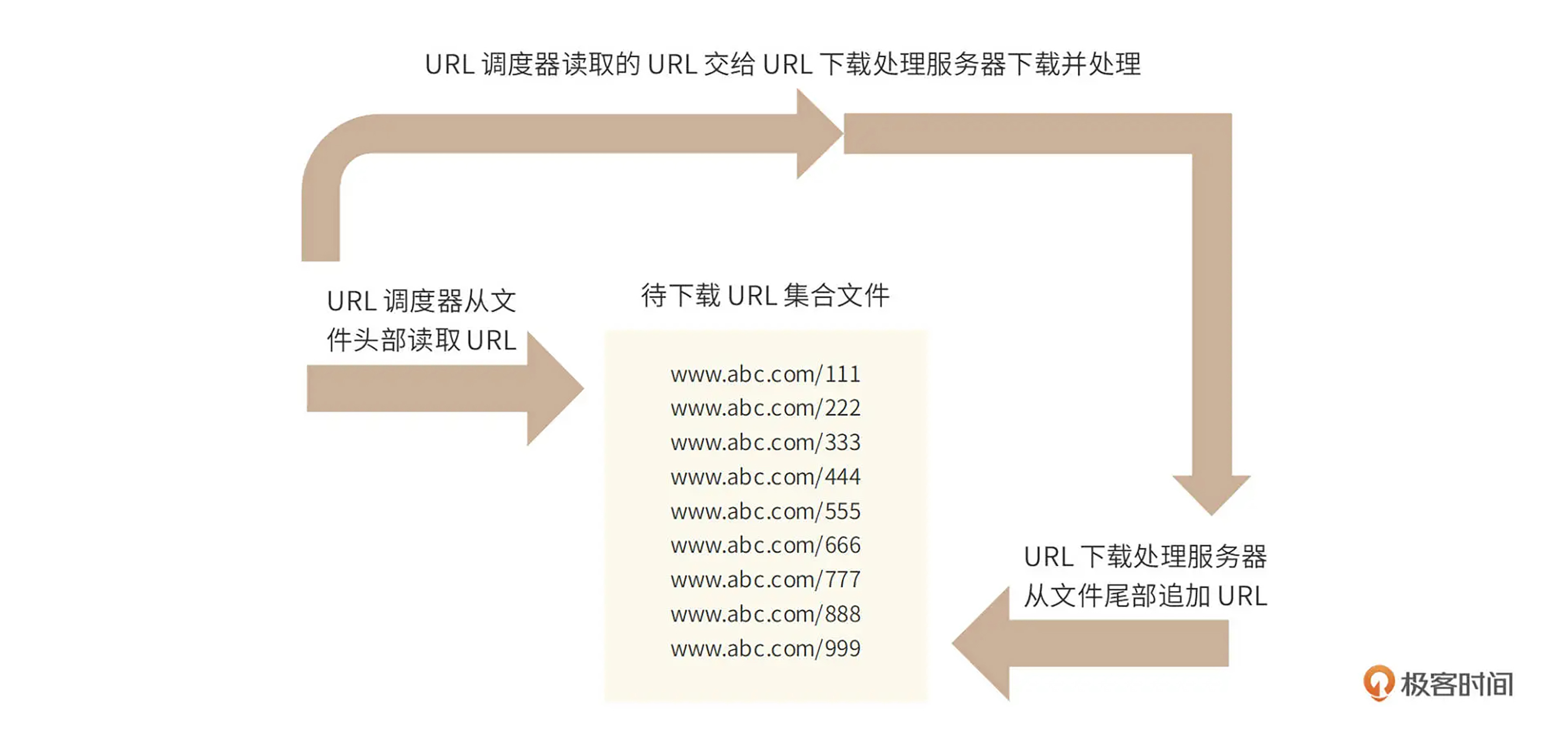 事实上,由于待下载URL集合存储在文件中,URL下载服务器只需要向待下载URL集合文件尾部追加URL记录,而URL调度器只需要从文件头顺序读取URL,这样就天然实现了先进先出的广度优先算法,如下图。