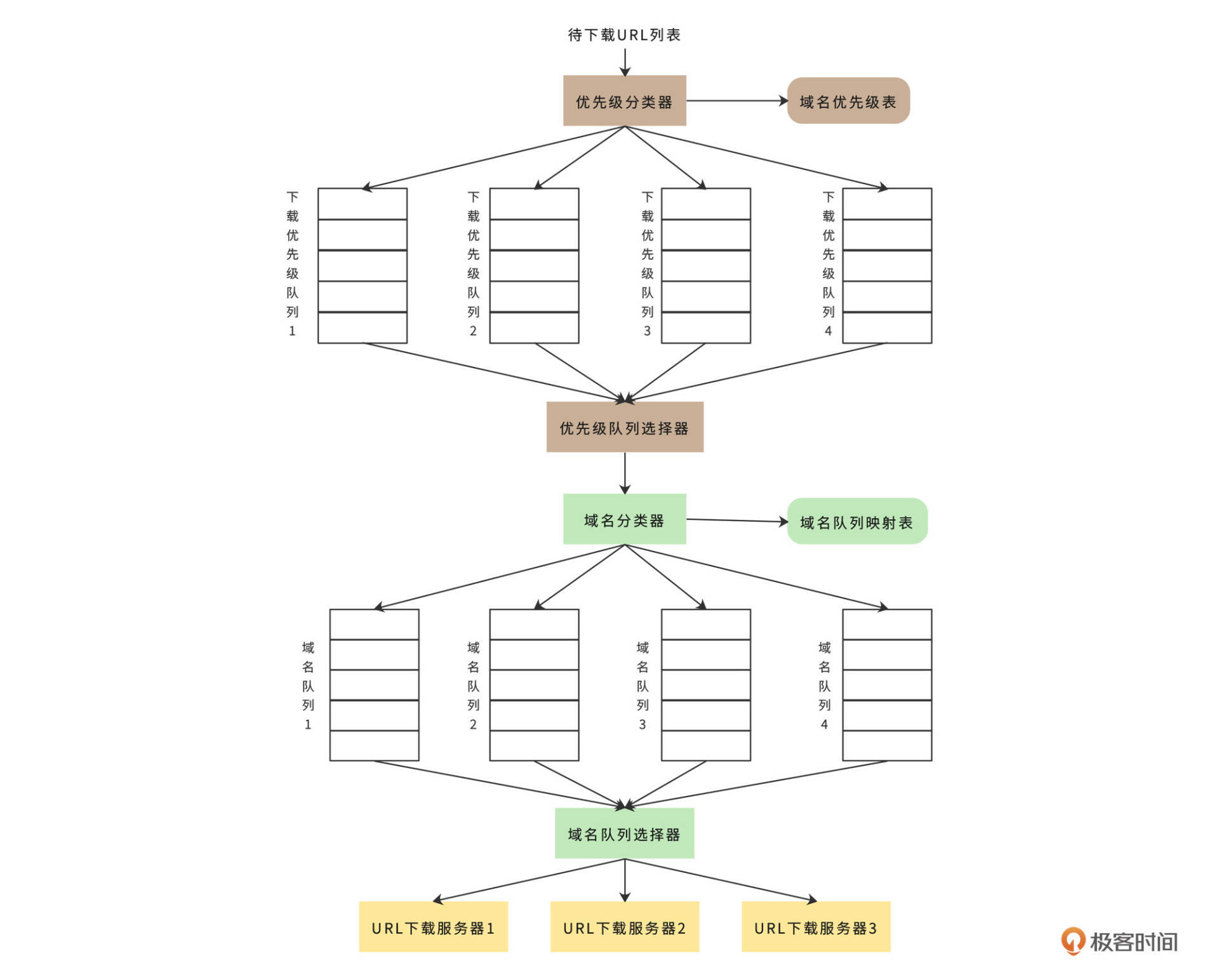 首先优先级分类器会根据网页内容质量将域名分类(后面专栏会讲PageRank质量排名算法),并为不同质量等级的域名设置不同的优先级,然后将不同优先级记录在“域名优先级表”中。