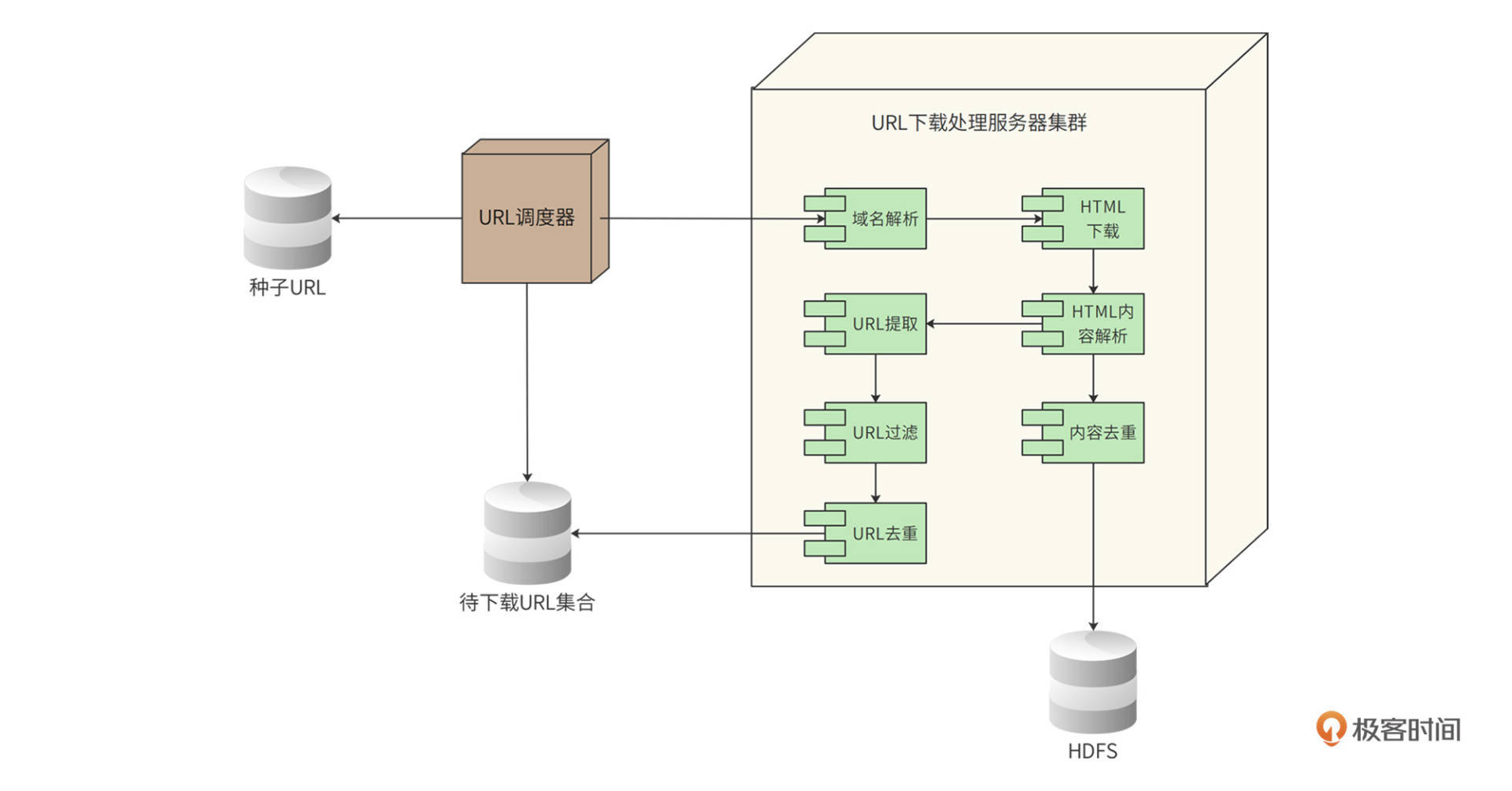 需要注意的是,URL下载处理服务器采用分布式集群部署,主要是为了提高系统的吞吐能力,使系统满足伸缩性需求。而URL调度器则只需要采用一台高性能的服务器单机部署即可。