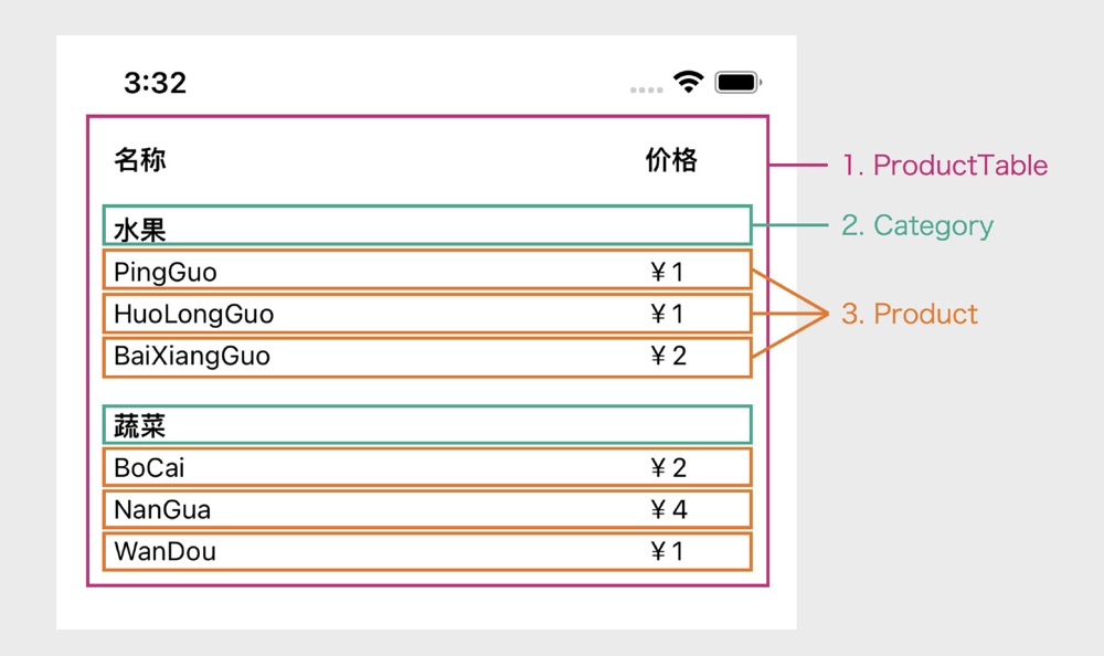 category是“水果”,第二次是“蔬菜”; - Product 组件:它会被 ProductTable 组件调用 6 次,生成 6 个不同的商品元素,展示在手机屏幕上。