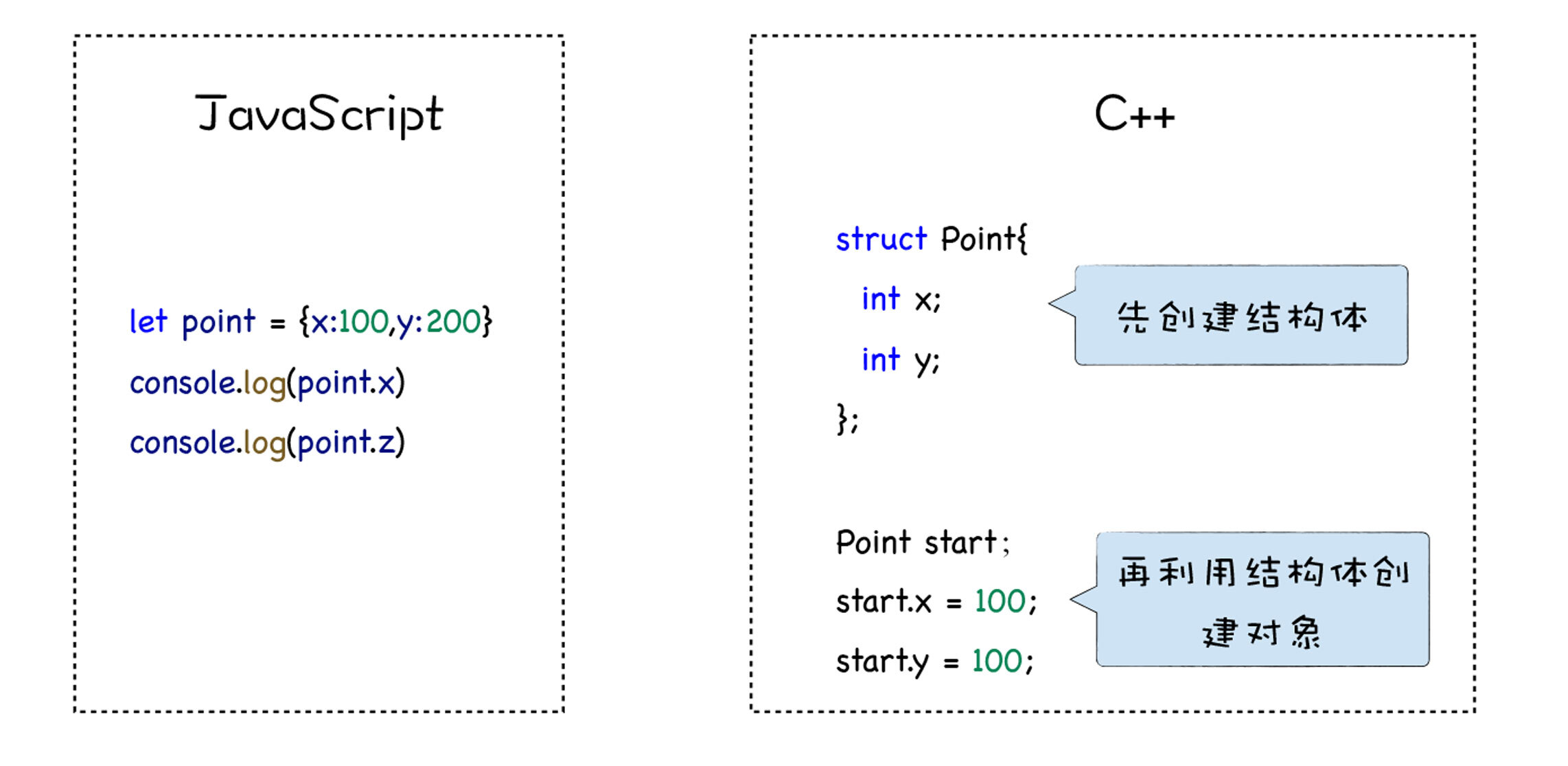 这种动态查询对象属性的方式和C++这种静态语言不同,C++在声明一个对象之前需要定义该对象的结构,我们也可以称为形状,比如Point结构体就是一种形状,我们可以使用这个形状来定义具体的对象。