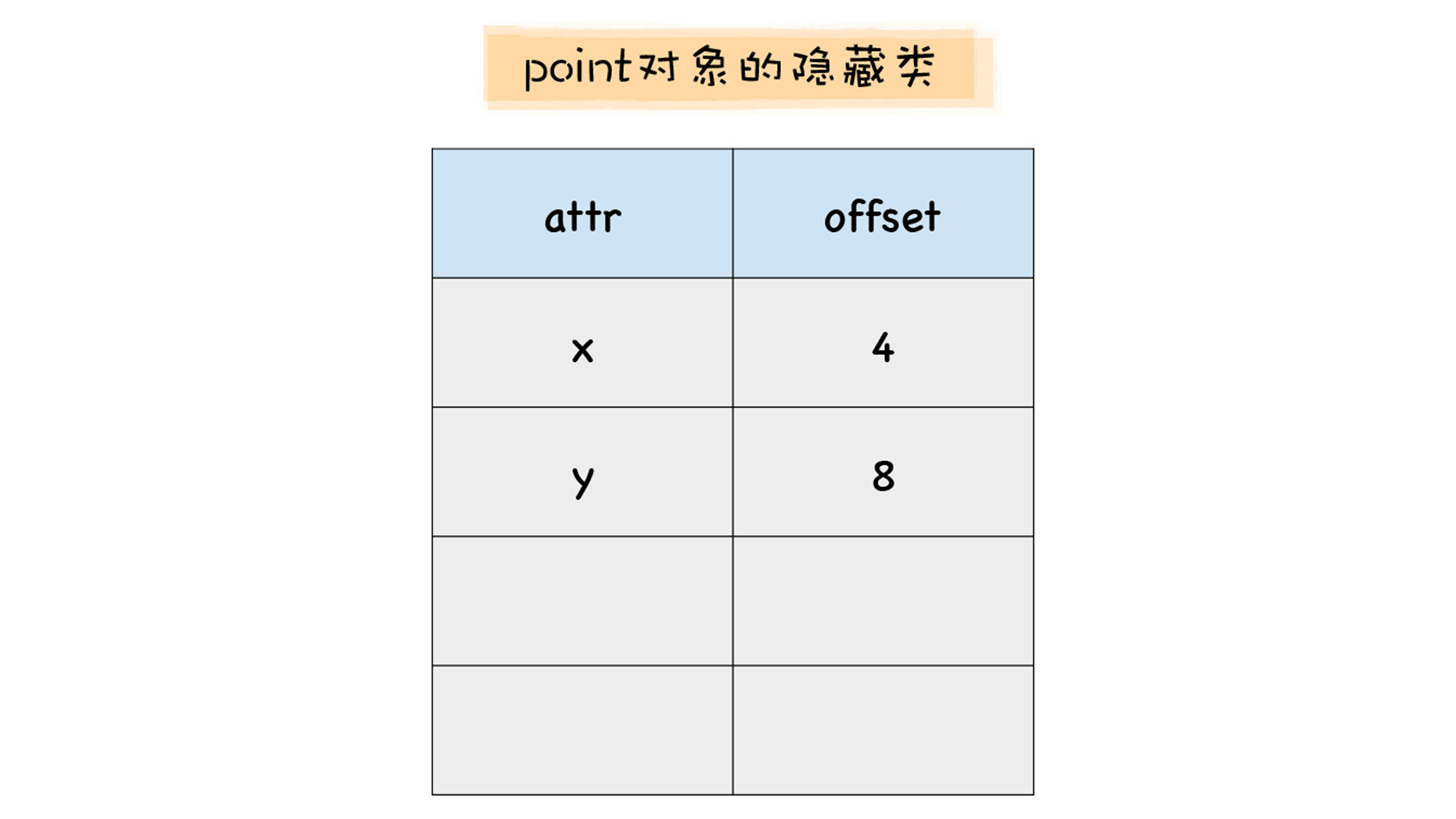 隐藏类描述了对象的属性布局,它主要包括了属性名称和每个属性所对应的偏移量,比如point对象的隐藏类就包括了x和y属性,x的偏移量是4,y的偏移量是8。