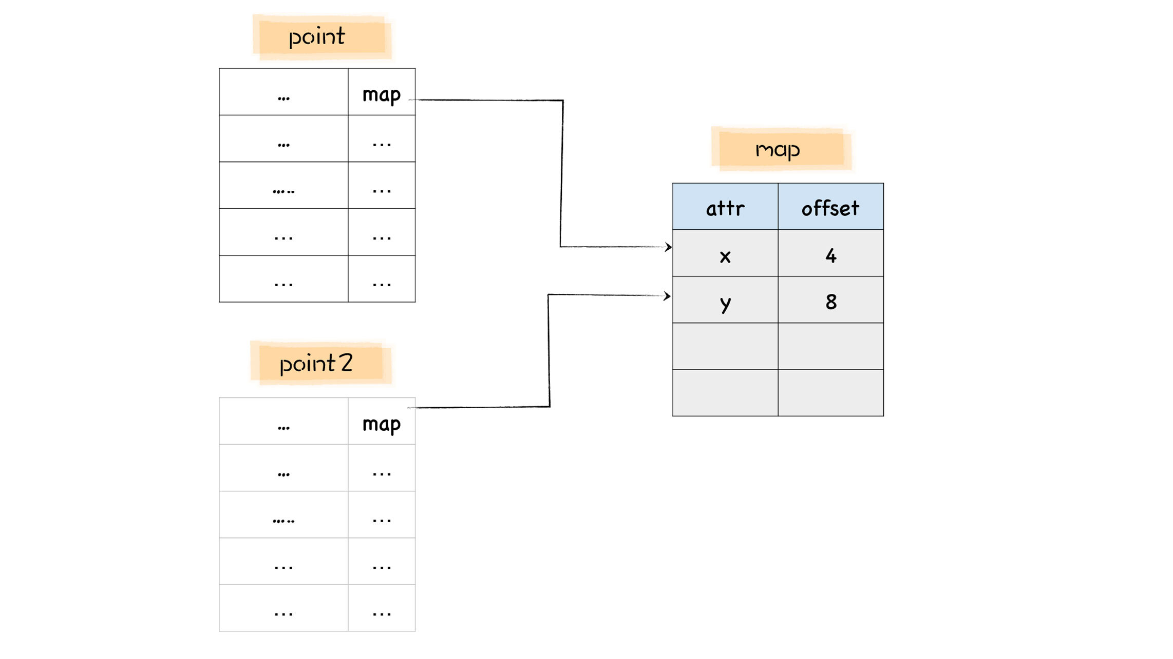 打印出来的point和point2对象,你会发现它们的map属性都指向了同一个地址,这也就意味着它们共用了同一个map。