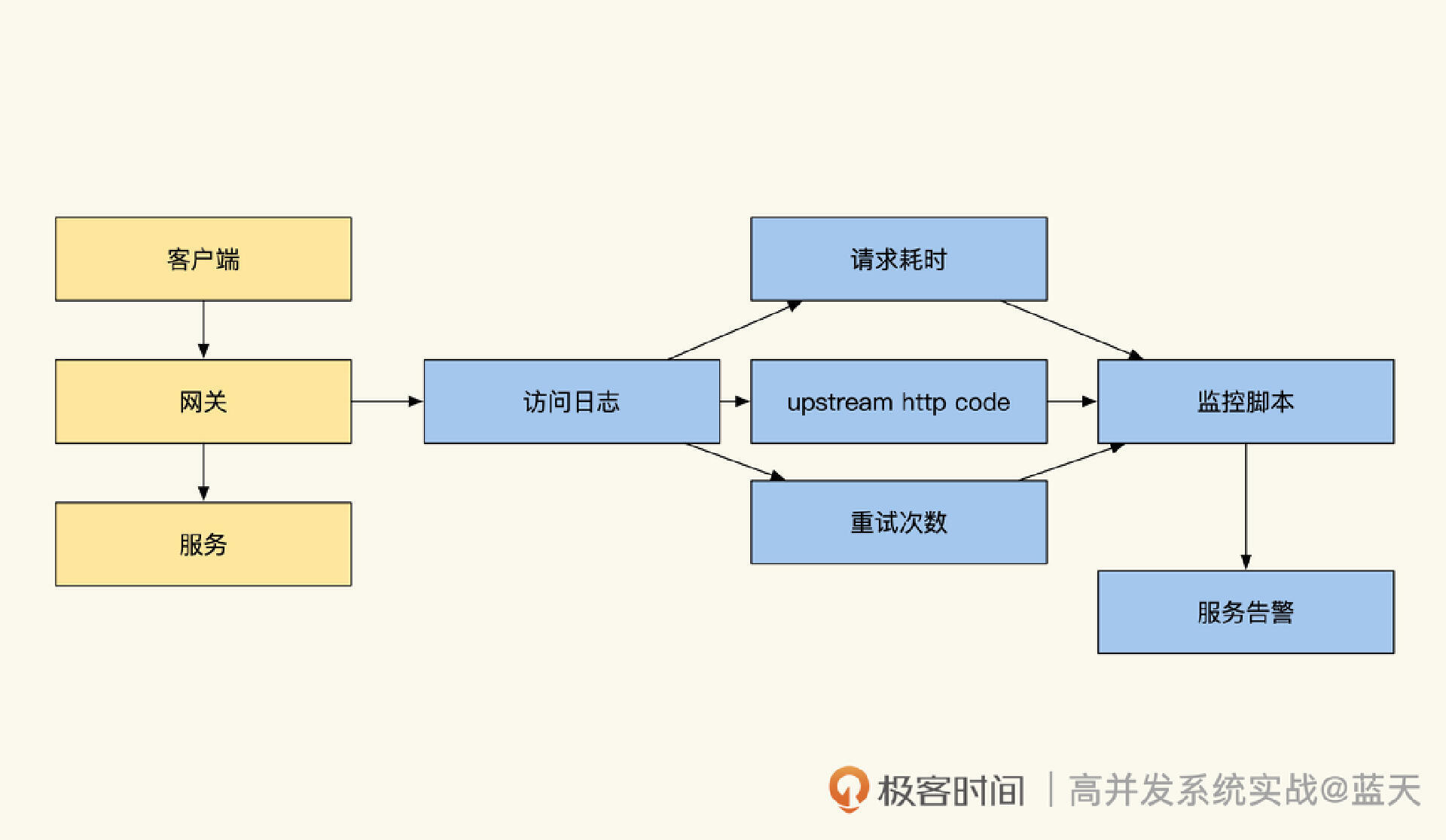 和其他监控不同,网关监控的方式可以监控到所有业务,只是粒度会大一些,不失为一个好方法。如果我们结合Trace,还可以将访问日志中落地Traceid,这样就能根据Traceid进一步排查问题原因,操作更方便,在好未来、极客时间都有类似的实现。