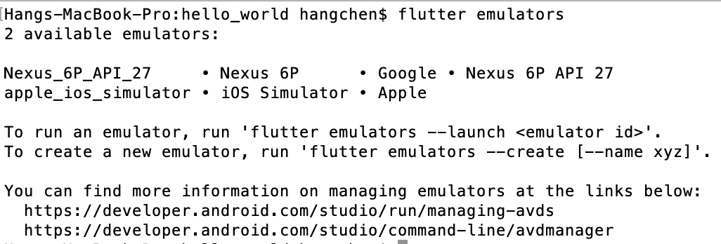 首先,我给你介绍的是通过Flutter命令行运行的模式。进入hello_world目录,输入flutter emulators命令,查看当前可用的模拟器: