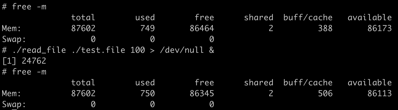还是用我们这一讲最开始的的例子:代码程序去读取100MB的文件,在读取文件前,系统中Page Cache的大小是388MB,读取后Page Cache的大小是506MB,增长了大约100MB左右,多出来的这100MB,正是我们读取文件的大小。