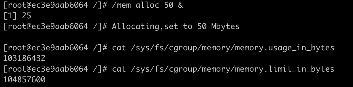 我们可以用这里的代码做个容器镜像,然后用下面的这个脚本启动容器,并且设置容器Memory Cgroup里的内存上限值是100MB(104857600bytes)。