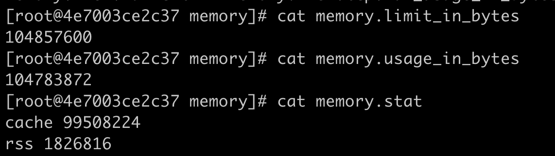 这时我们再去查看参数memory.usage_in_bytes,就会发现它的值变成了103186432bytes,比之前还少了一些。那这是怎么回事呢?