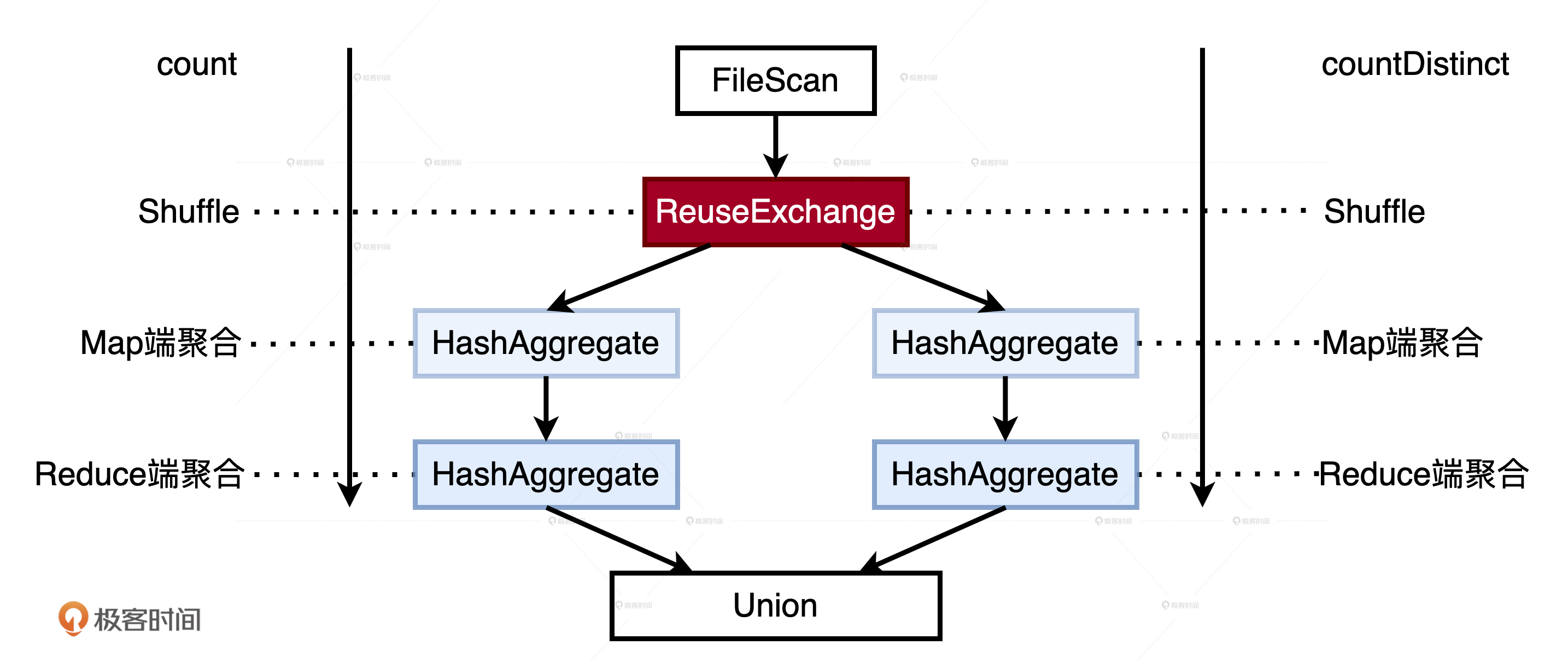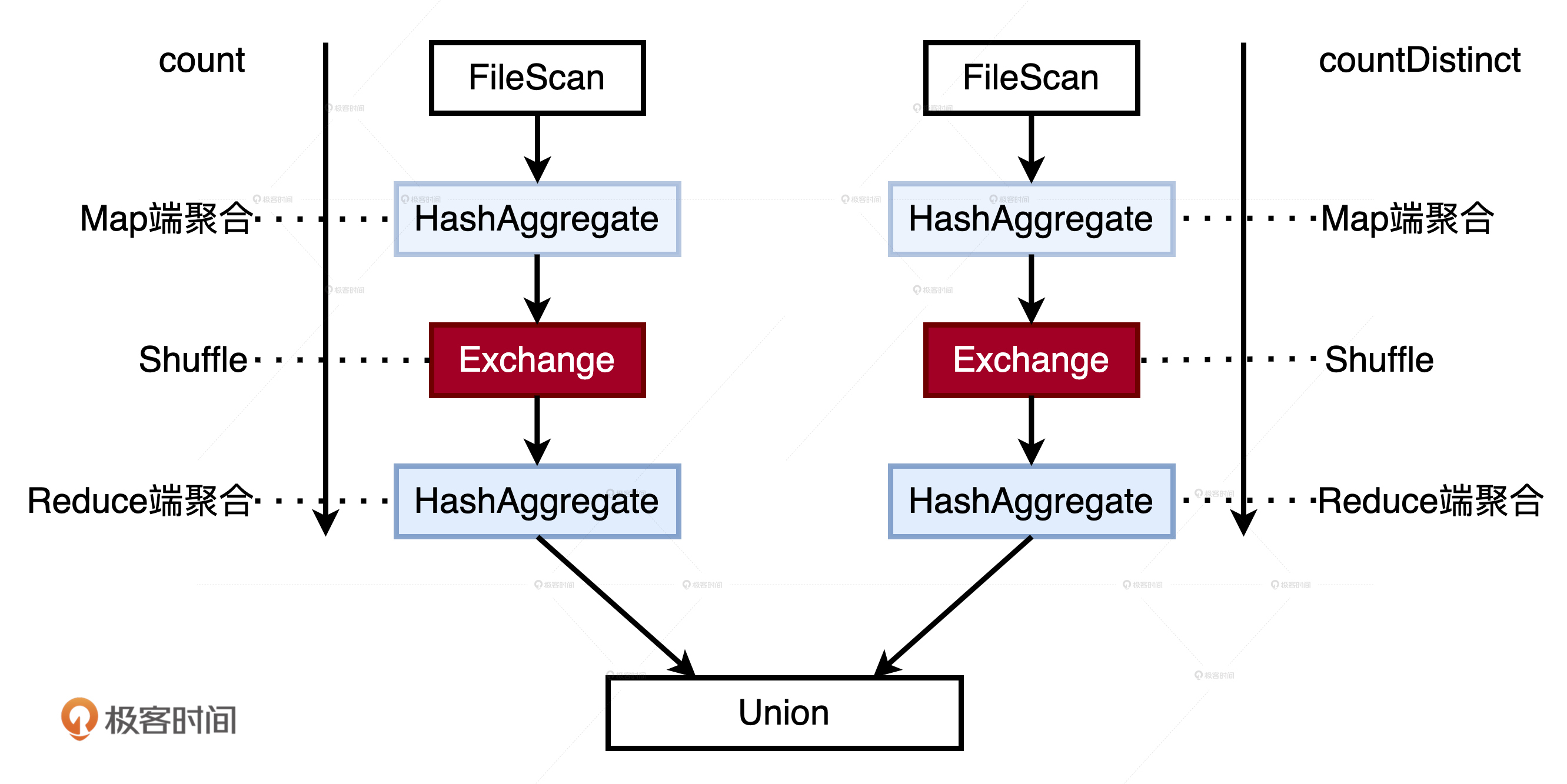 虽然代码实现起来简单直接,但是,如果我们在resultDF之上调用explain或是通过Spark UI去查看物理计划就会发现,尽管count和countDistinct是基于同一份数据源计算的,但这两个操作的执行路径是完全独立的。它们各自扫描Parquet源文件,并且通过Shuffle完成计算,在Shuffle之前会先在Map端做本地聚合,Shuffle之后会在Reduce端再进行全局聚合。