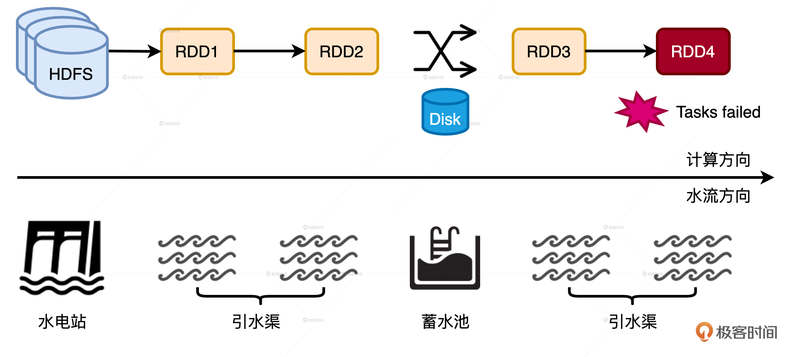 一个水电站往往服务方圆百里大大小小的村子,如果每次灌溉都等着水电站开闸放水,遇上大旱的年头,水还没流到支渠,麦苗就都旱死了。要是能沿着干渠,每隔一段距离就修建一座蓄水池,那么附近的村民就能就近灌溉了。在这个干渠灌溉的类比中,水电站的水是HDFS数据源头,蓄水池就是Shuffle中间文件,就近取水、就近灌溉就是磁盘复用机制。