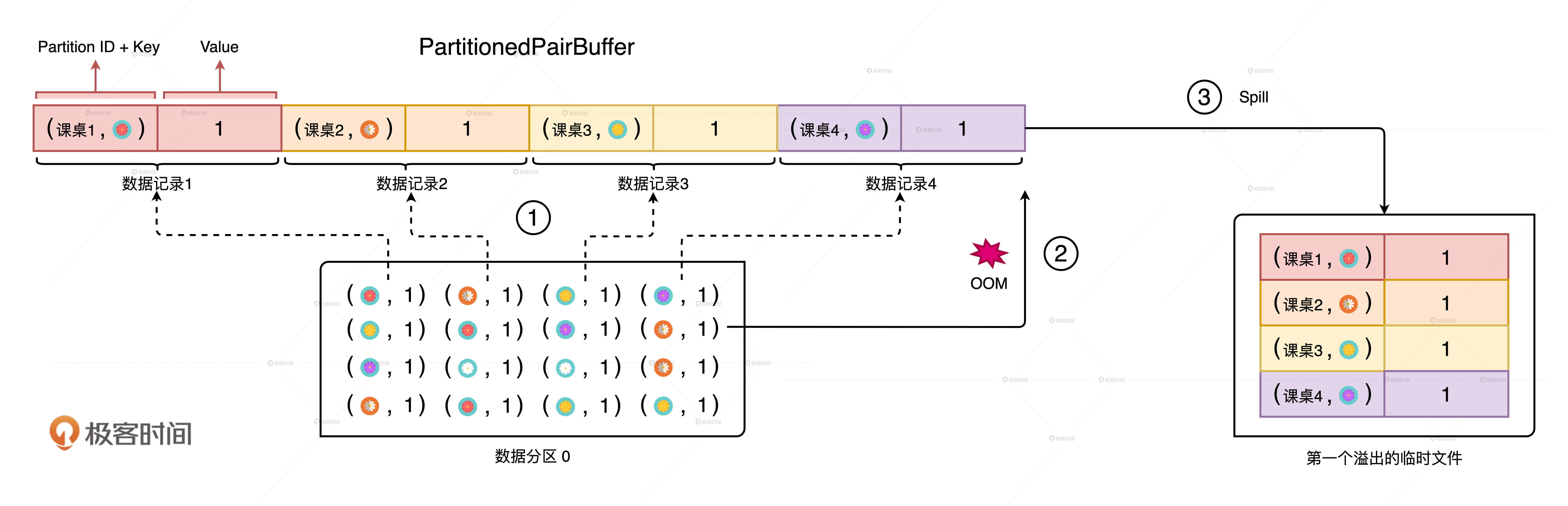 在Spark当中,磁盘都用在哪些地方呢?在Shuffle那一讲我们说过,在Map阶段,Spark根据计算是否需要聚合,分别采用PartitionedPairBuffer和PartitionedAppendOnlyMap两种不同的内存数据结构来缓存分片中的数据记录。分布式计算往往涉及海量数据,因此这些数据结构通常都没办法装满分区中的所有数据。在内存受限的情况下,溢出机制可以保证任务的顺利执行,不会因为内存空间不足就立即报OOM异常。