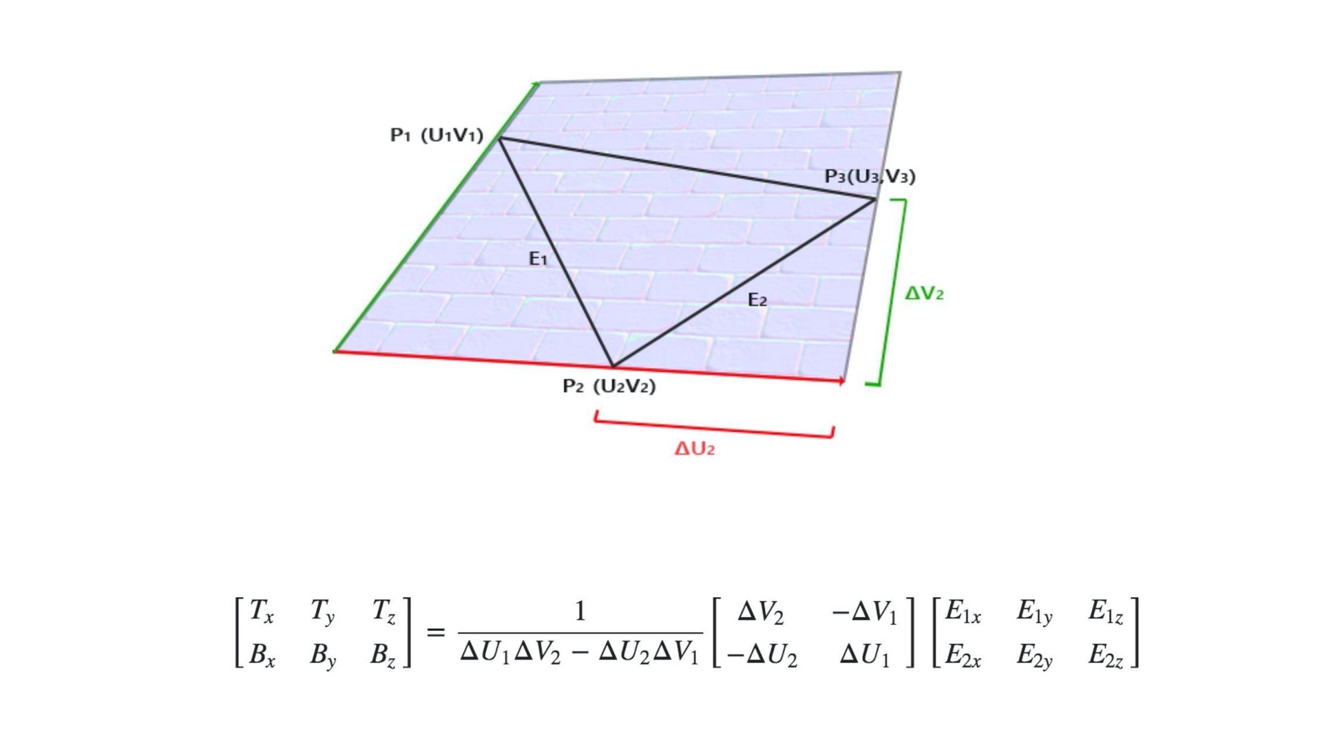如上图和公式,我们就可以通过UV坐标和点P1、P2、P3的坐标求出对应的T和B坐标了,对应的JavaScript函数如下: