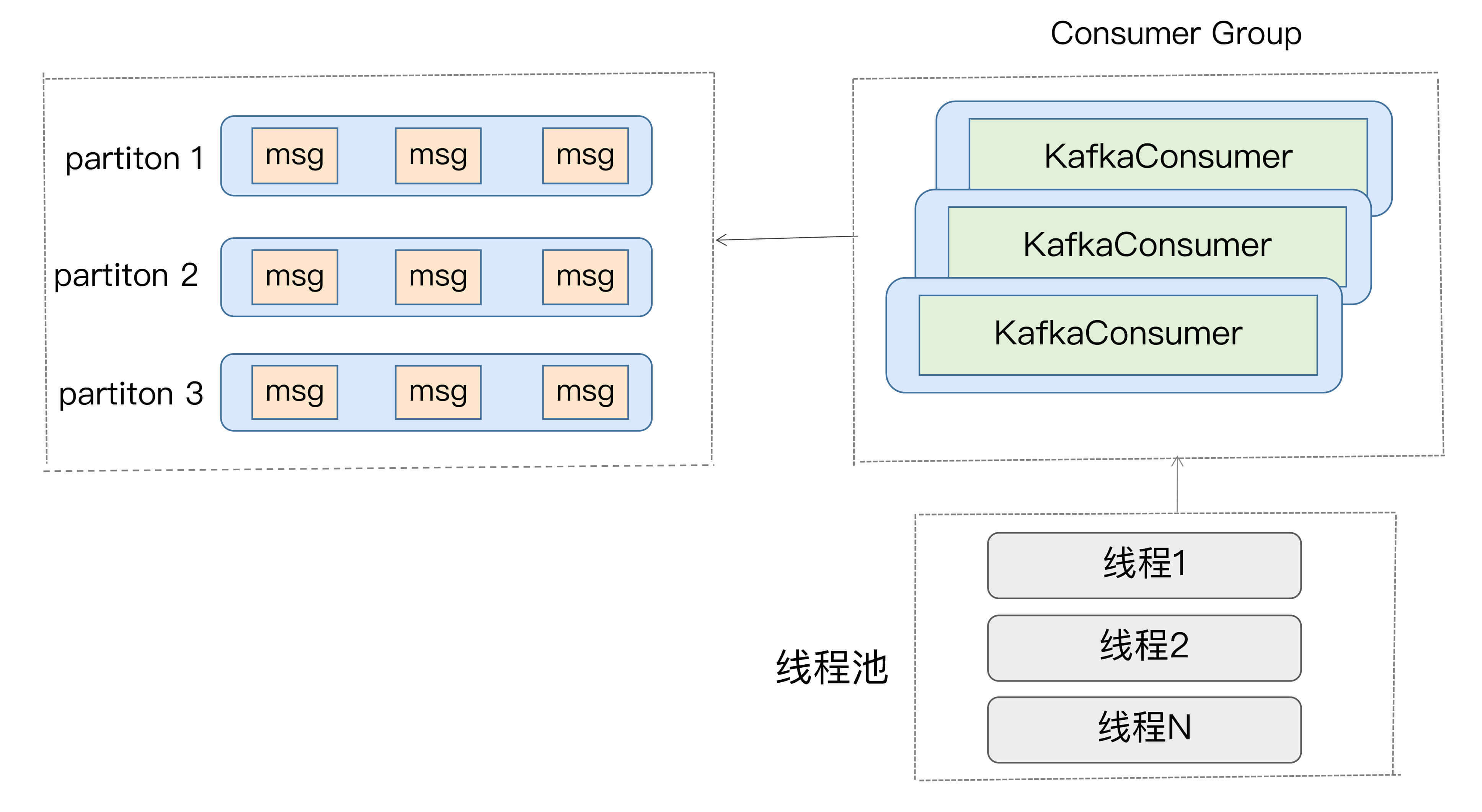 这段代码最重要的地方是最后一行:当Consumer的poll方法返回消息后,由专门的线程池来负责处理具体的消息。调用poll方法的主线程不负责消息处理逻辑,这样就实现了方案2的多线程架构。