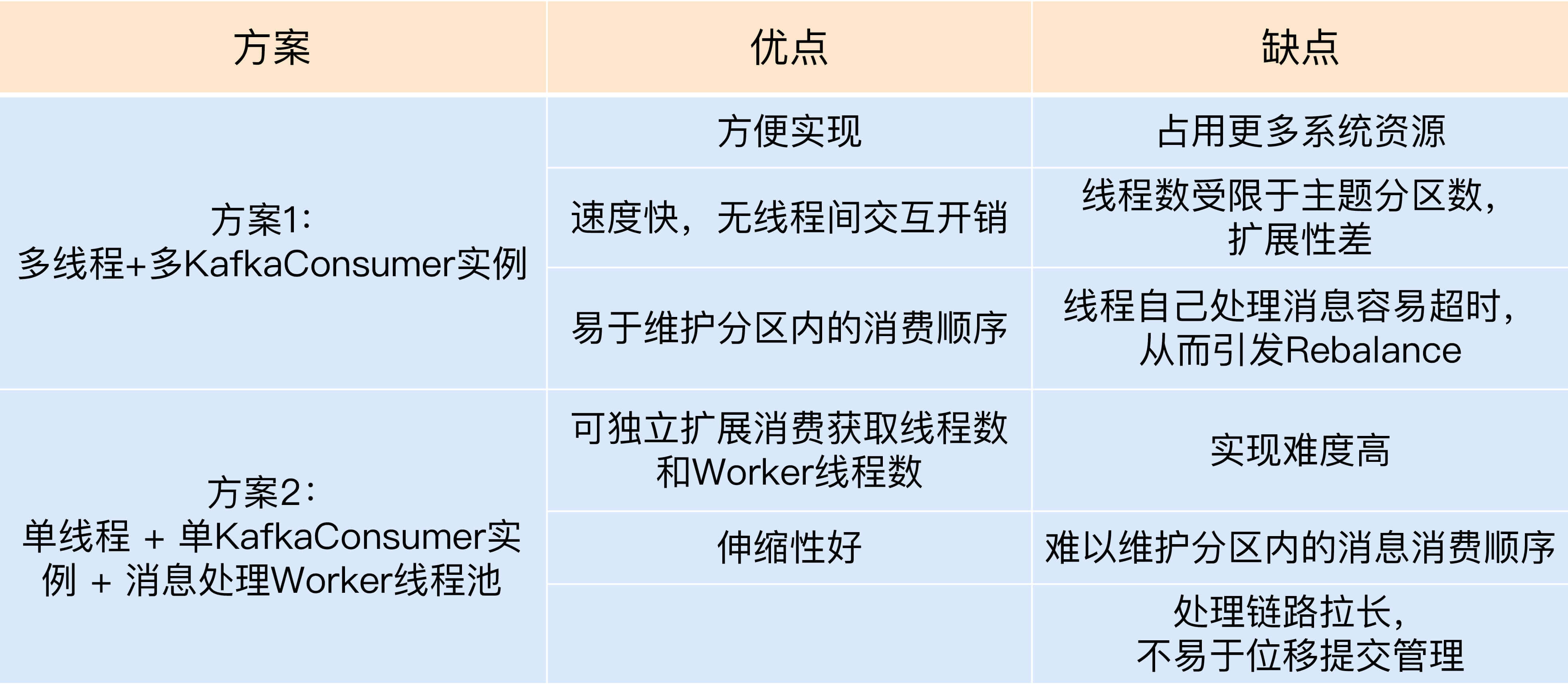 - 因为该方案将消息获取和消息处理分开了,也就是说获取某条消息的线程不是处理该消息的线程,因此无法保证分区内的消费顺序。举个例子,比如在某个分区中,消息1在消息2之前被保存,那么Consumer获取消息的顺序必然是消息1在前,消息2在后,但是,后面的Worker线程却有可能先处理消息2,再处理消息1,这就破坏了消息在分区中的顺序。还是那句话,如果你在意Kafka中消息的先后顺序,方案2的这个劣势是致命的。