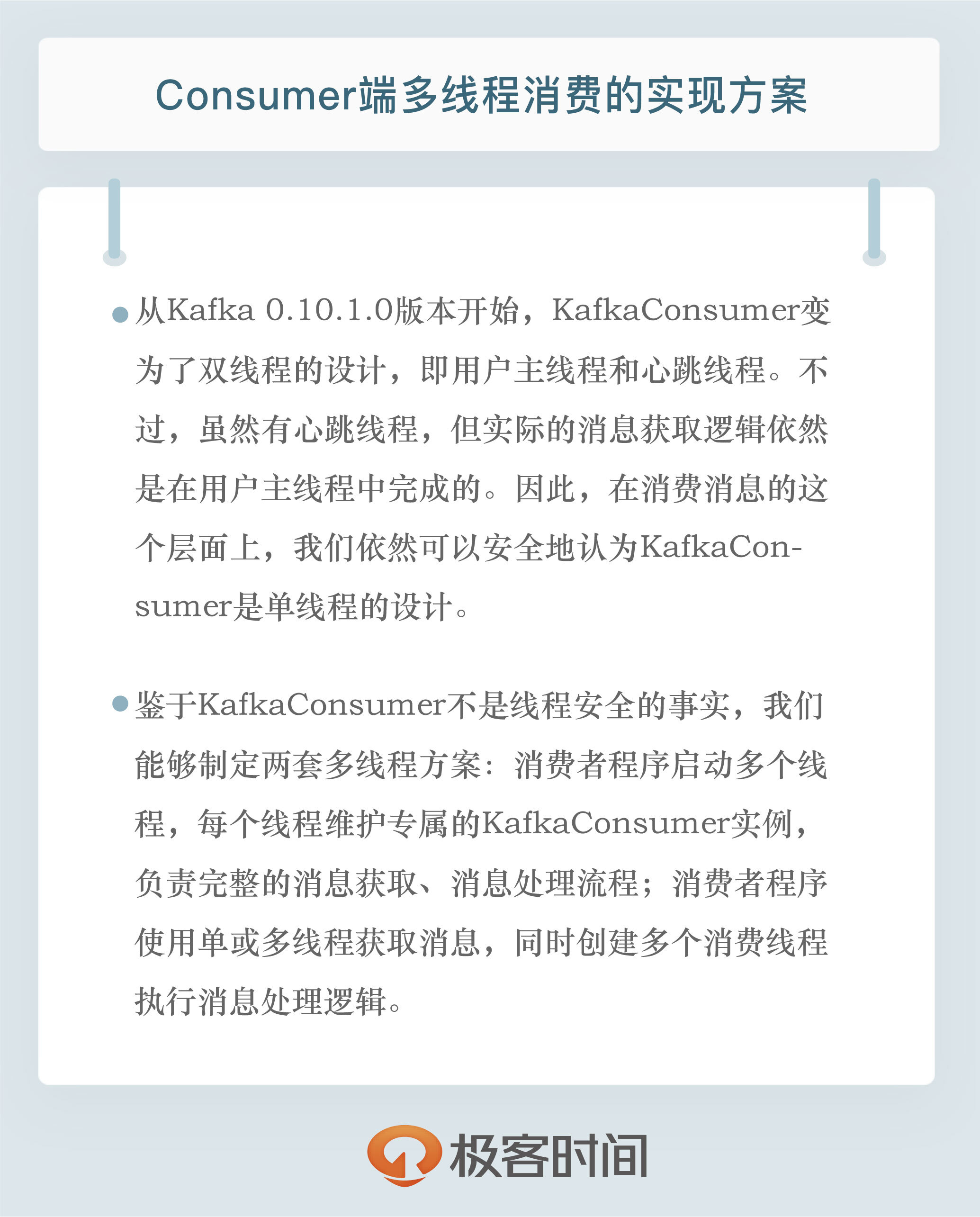 总结一下,今天我跟你分享了Kafka Java Consumer多线程消费的实现方案。我给出了比较通用的两种方案,并介绍了它们各自的优缺点以及代码示例。我希望你能根据这些内容,结合你的实际业务场景,实现适合你自己的多线程架构,真正做到举一反三、融会贯通,彻底掌握多线程消费的精髓,从而在日后实现更宏大的系统。