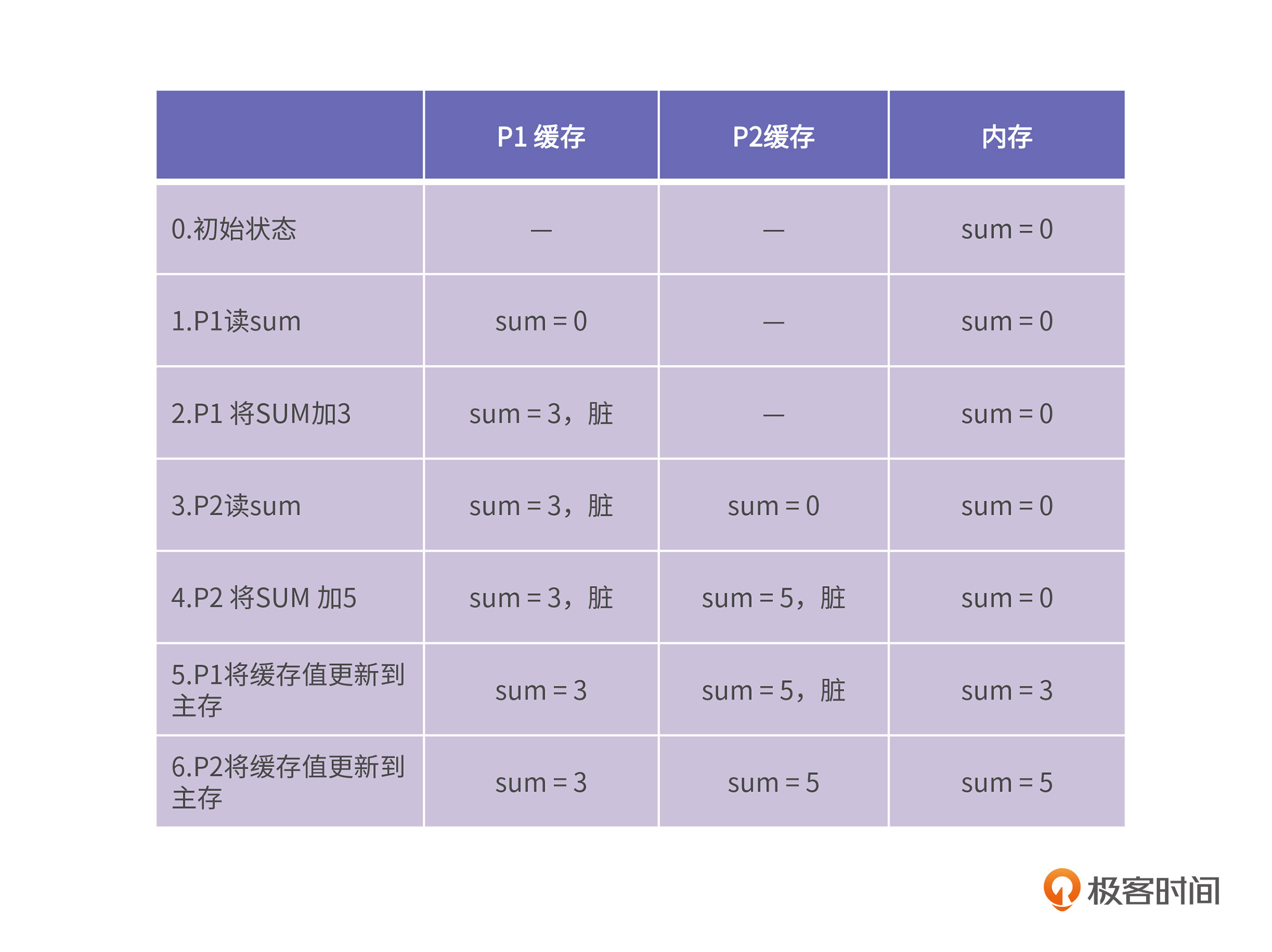 上表中展示了一种内存中sum值为5的操作序列。但是,第5步和第6步的顺序有可能会对调,所以sum值还有可能是3。如果第3步,P1的缓存中的值能被正确地传播到P2,那么P2的sum值就为8,所以最终内存中的值还有可能是8。