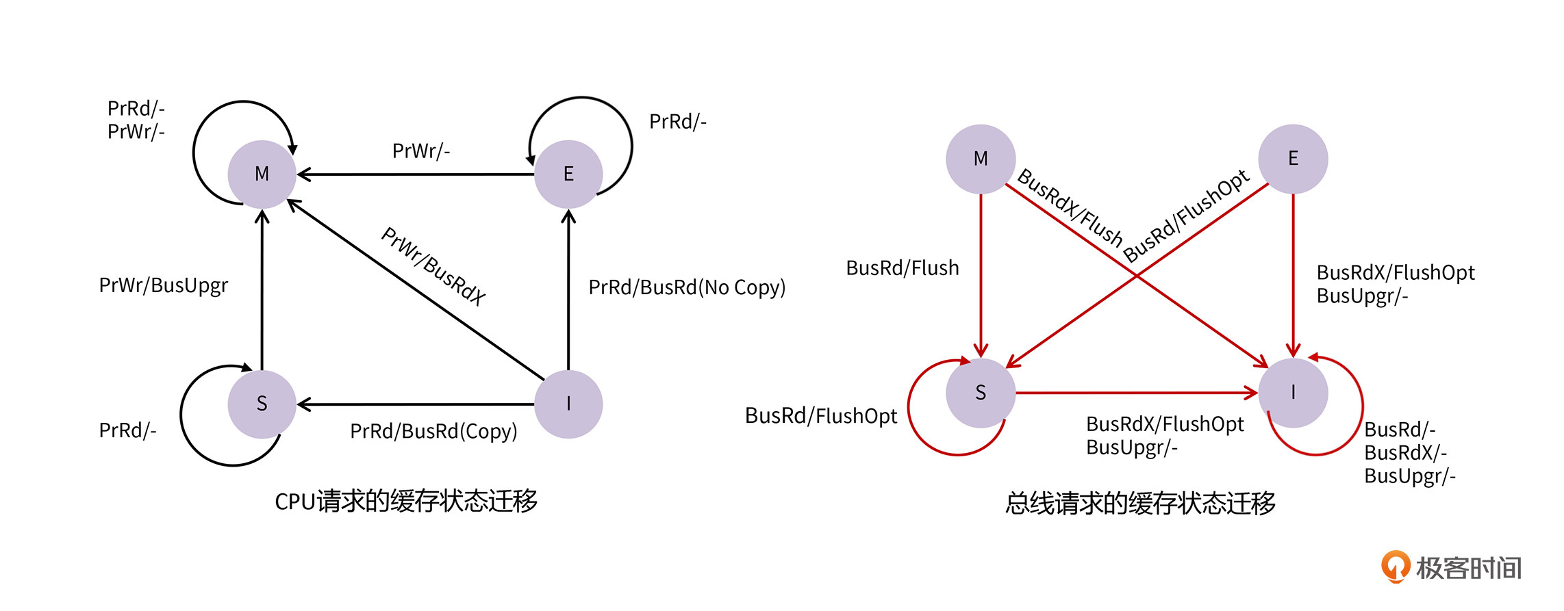 接着,我们讨论了在写回策略和写直达策略中,缓存的状态和它的状态迁移的情况。状态迁移要考虑两种动作:一是本CPU所发起的请求,以Pr开头;另一个是其他CPU发起的请求,这些请求最终会通过总线发送过来,以Bus开头。一个CPU发起请求的同时,还会产生总线事件。