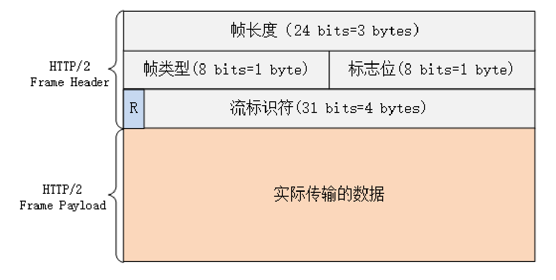 HTTP/2的帧结构有点类似TCP的段或者TLS里的记录,但报头很小,只有9字节,非常地节省(可以对比一下TCP头,它最少是20个字节)。
