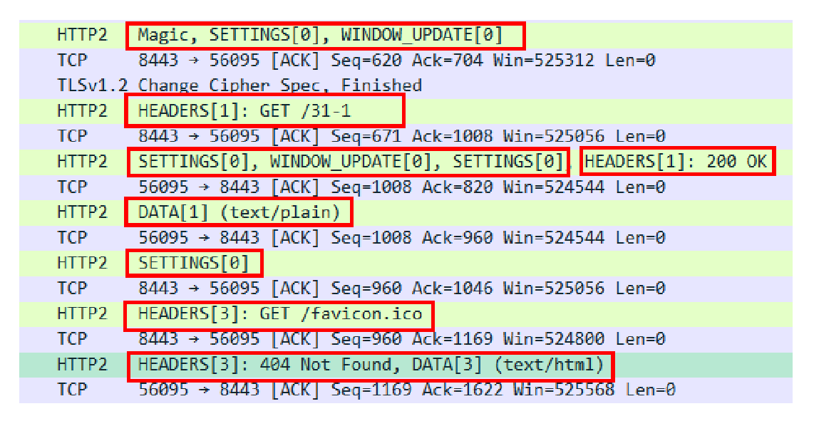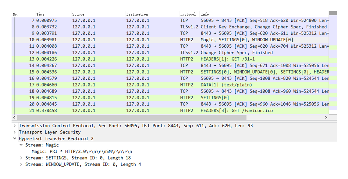 你可以再看一下Wireshark的抓包,里面发送了两个请求“/31-1”和“/favicon.ico”,始终用的是“56095<->8443”这个连接,对比一下[第8讲],你就能够看出差异了。