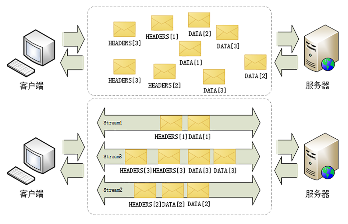 - 流是可并发的,一个HTTP/2连接上可以同时发出多个流传输数据,也就是并发多请求,实现“多路复用”;