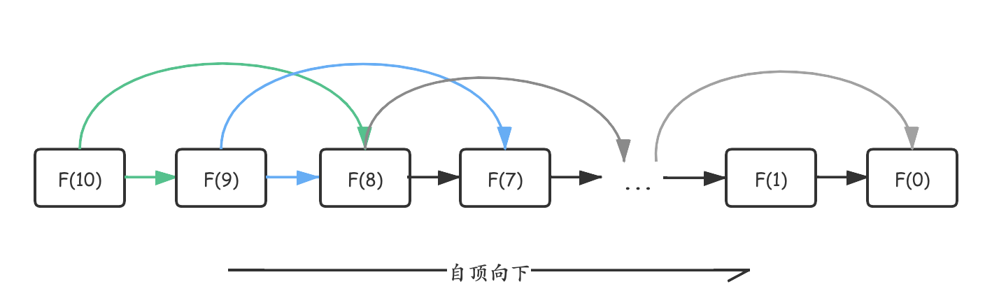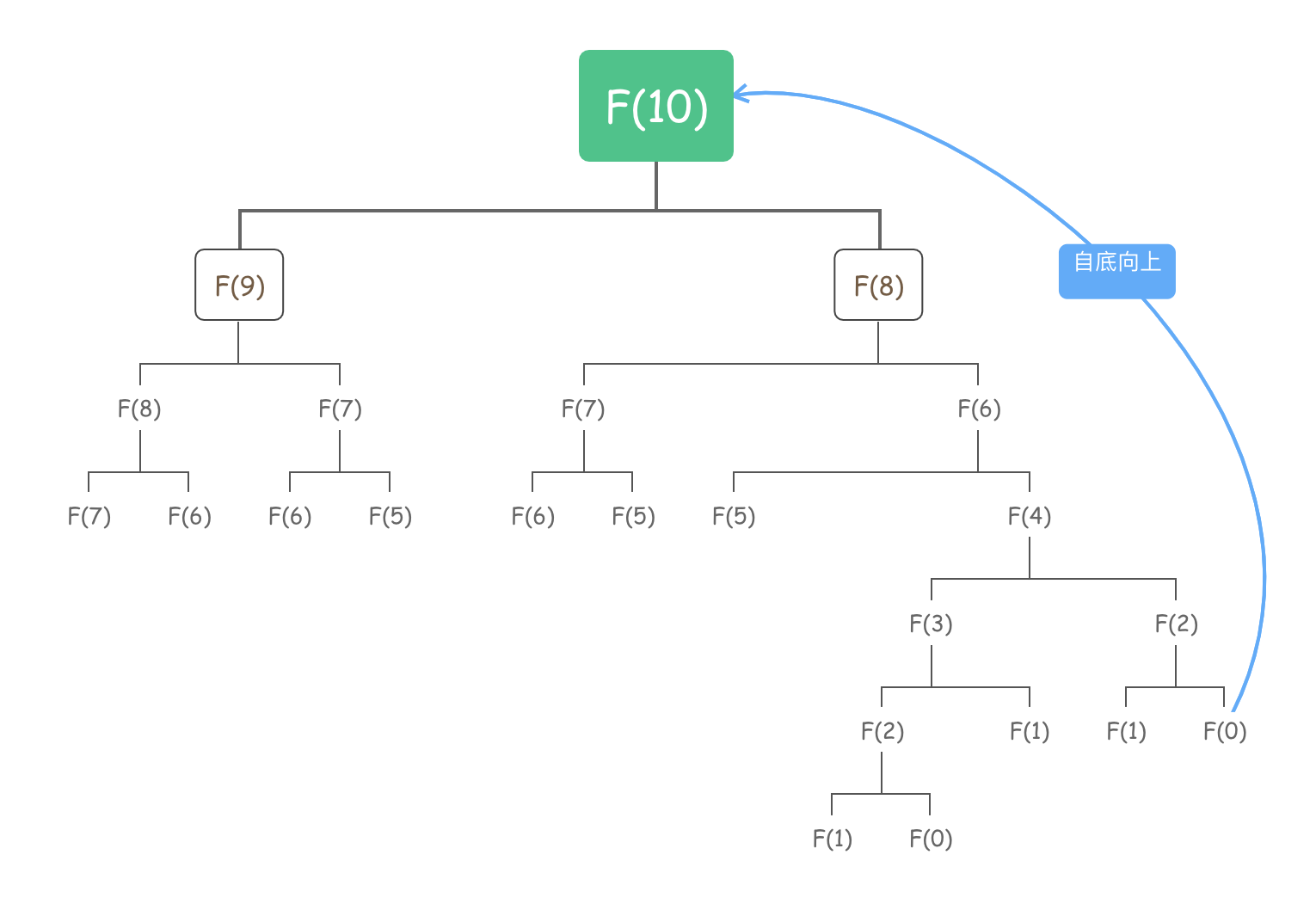 那么如果要自底向上,我们是不是可以首先求出所有的子问题,然后通过底层的子问题向上求解更大的问题。我还是通过斐波那契数列来画出自底向上的处理方式: