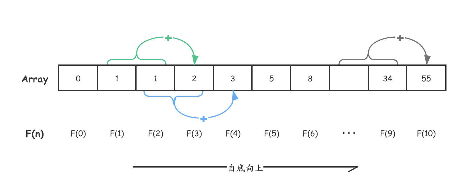 这样一来,借助于自底向上的方法,我们成功的将递归转换成了迭代。
