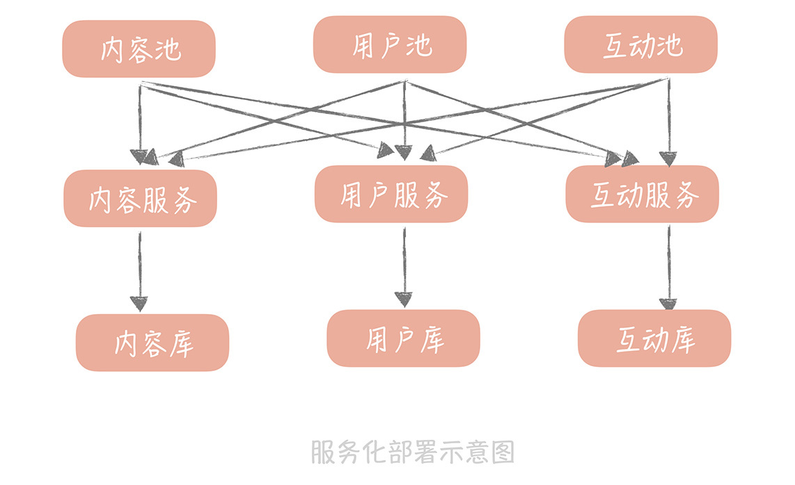 由于这个服务只处理和用户相关的逻辑,所以不需要部署太多的实例就可以承担流量,这样就可以有效地控制用户库的连接数,提升了系统的可扩展性。那么如此一来,我们也可以将内容和互动相关的逻辑都独立出来,形成内容服务和互动服务,这样我们就通过按照业务做横向拆分的方式解决了数据库层面的扩展性问题。