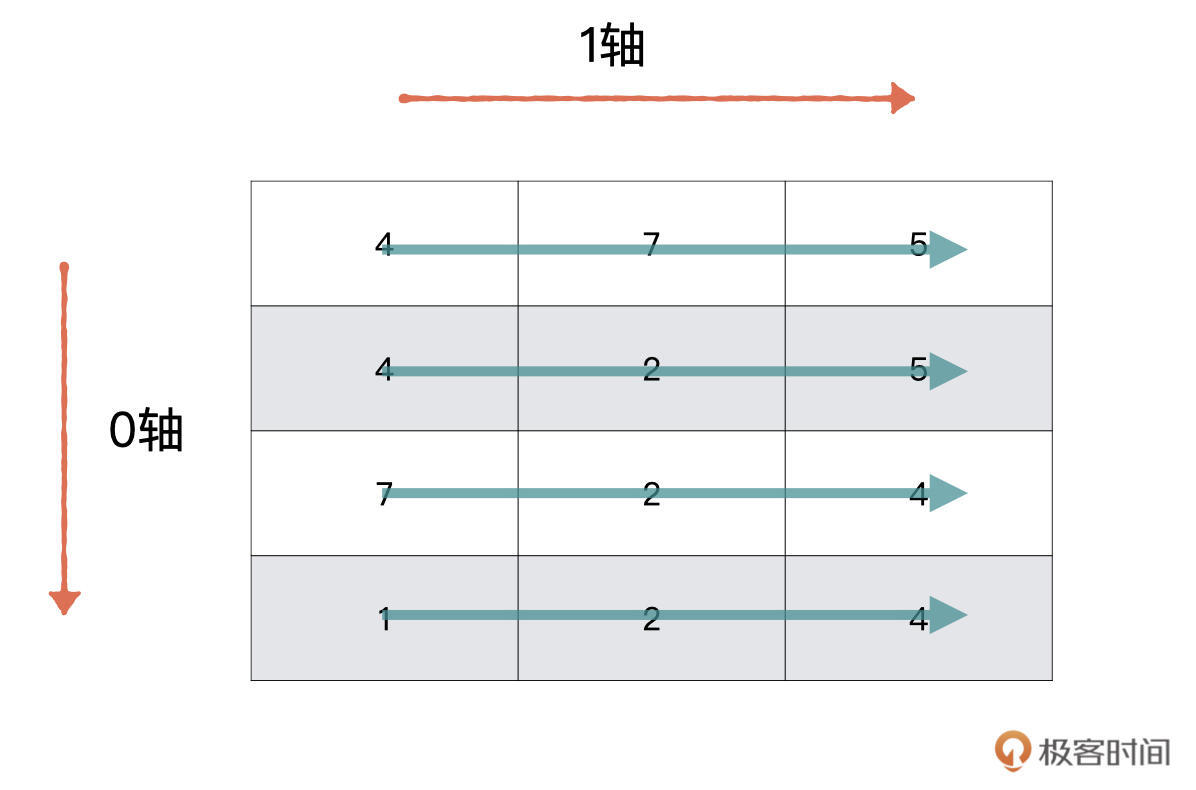 数组的轴即数组的维度,它是从0开始的。对于我们这个二维数组来说,有两个轴,分别是代表行的0轴与代表列的1轴。如下图所示。