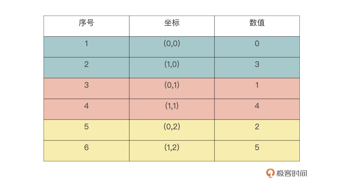 所以,reshape后的数组,是按照0,3,1,4,2,5这个序列进行写入数据的。reshape后的数组如下表所示,序号代表写入顺序,为了显示直观,我将相同行以同样颜色显示了。