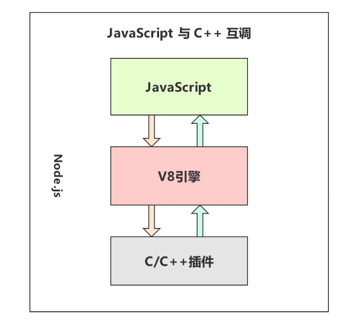 此时,JavaScript 就可以通过 V8 引擎调用 C/C++ 编写的接口了。接口执行完后,再将执行的结果返回给 JavaScript。以上就是JavaScript 与 C/C++ 相互调用的基本原理。