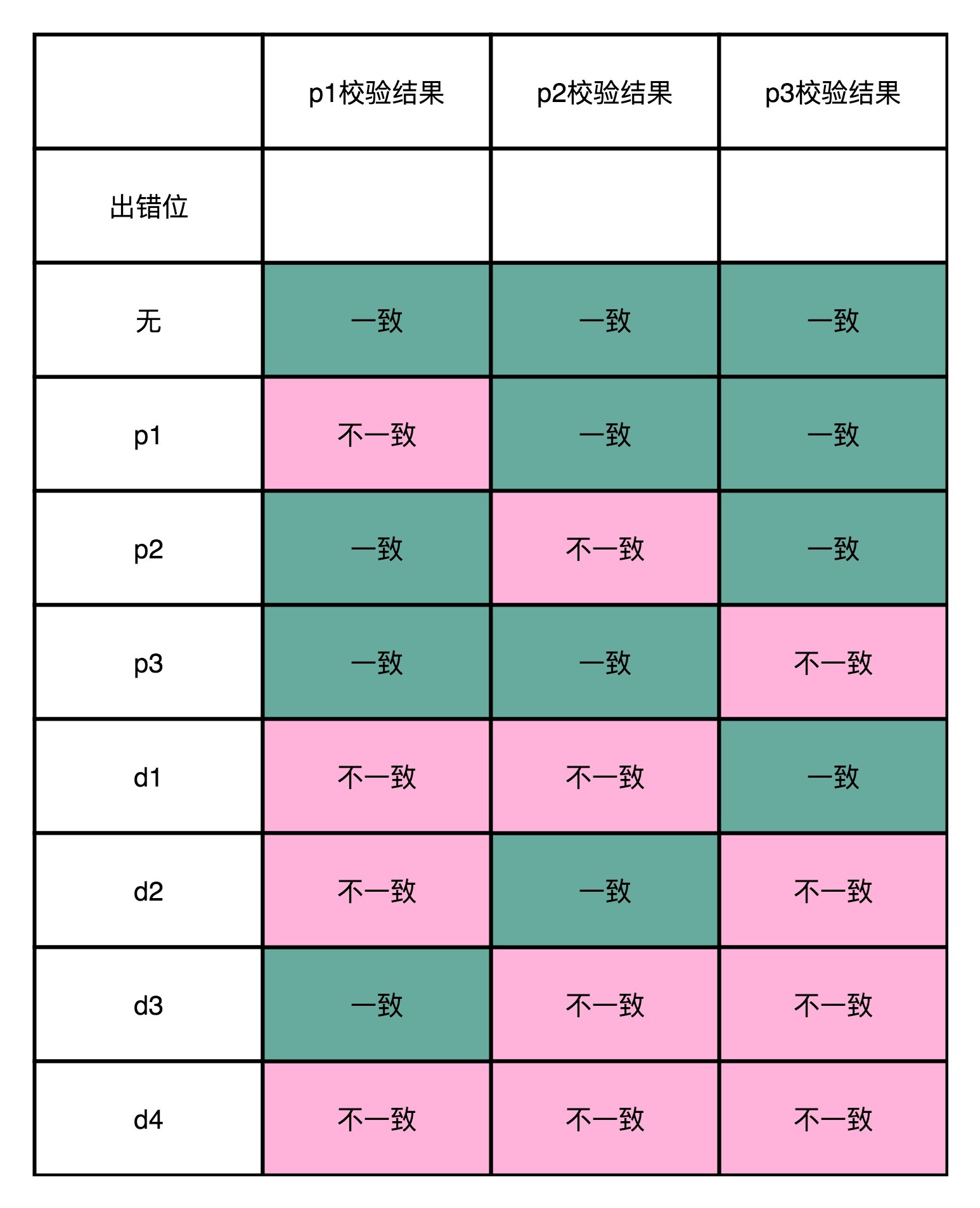 那我们倒过来,如果是p1的校验码出错了,会发生什么情况呢?这个时候,只有p1的校验结果出错。p2和p3的出错的结果也是一样的,只有一个校验码的计算是不一致的。