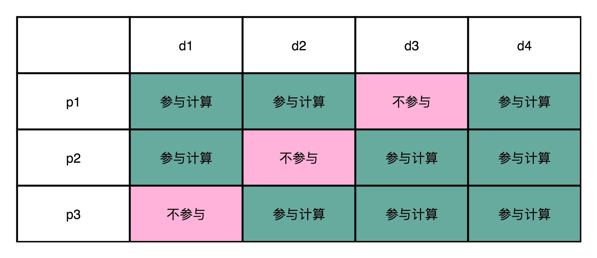 从4位的数据位里面,我们拿走1位,然后计算出一个对应的校验位。这个校验位的计算用之前讲过的奇偶校验就可以了。比如,我们用d1、d2、d4来计算出一个校验位p1;用d1、d3、d4计算出一个校验位p2;用d2、d3、d4计算出一个校验位p3。就像下面这个对应的表格一样: