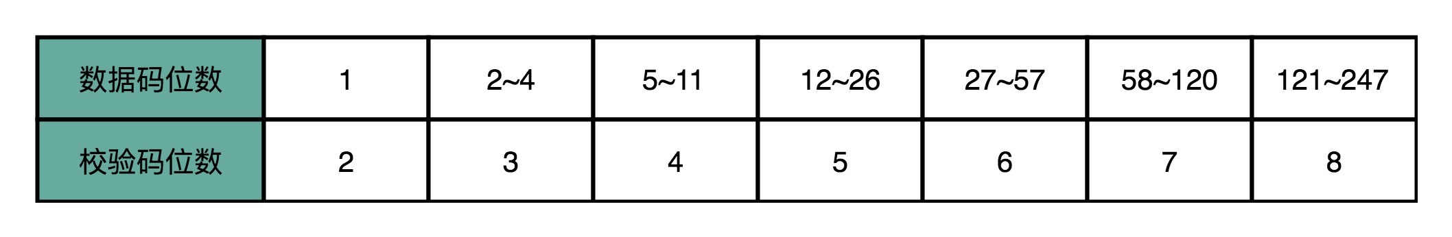 通过在数据中添加多个冗余的校验码位,海明码不仅能够检测到数据中的错误,还能够在只有单个位的数据出错的时候,把错误的一位纠正过来。在理解和计算海明码的过程中,有一个很重要的点,就是不仅原来的数据位可能出错。我们新添加的校验位,一样可能会出现单比特翻转的错误。这也是为什么,7位数据位用3位校验码位是不够的,而需要4位校验码位。