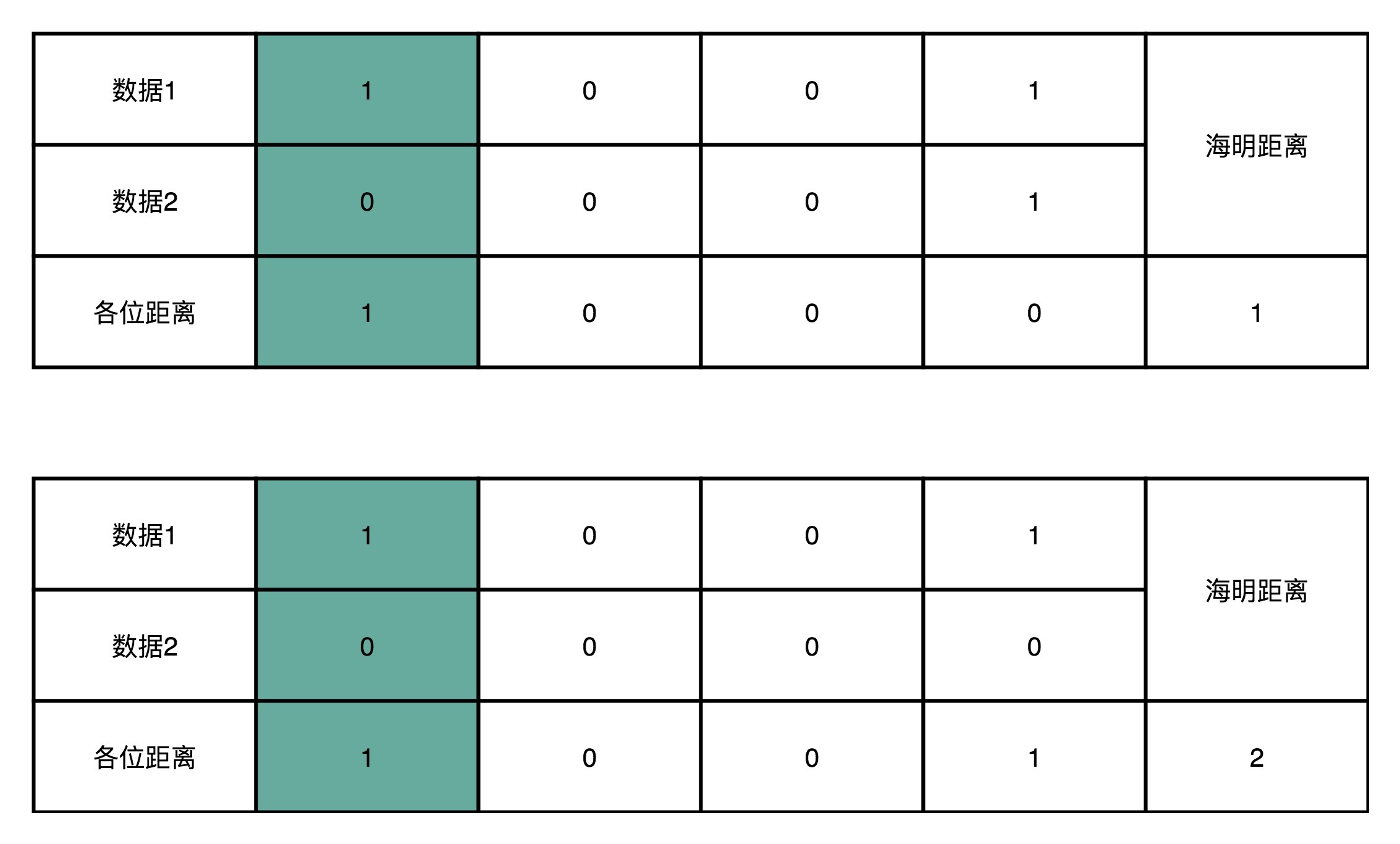 其实,我们还可以换一个角度来理解海明码的作用。对于两个二进制表示的数据,他们之间有差异的位数,我们称之为海明距离。比如 1001 和 0001 的海明距离是1,因为他们只有最左侧的第一位是不同的。而1001 和 0000 的海明距离是2,因为他们最左侧和最右侧有两位是不同的。