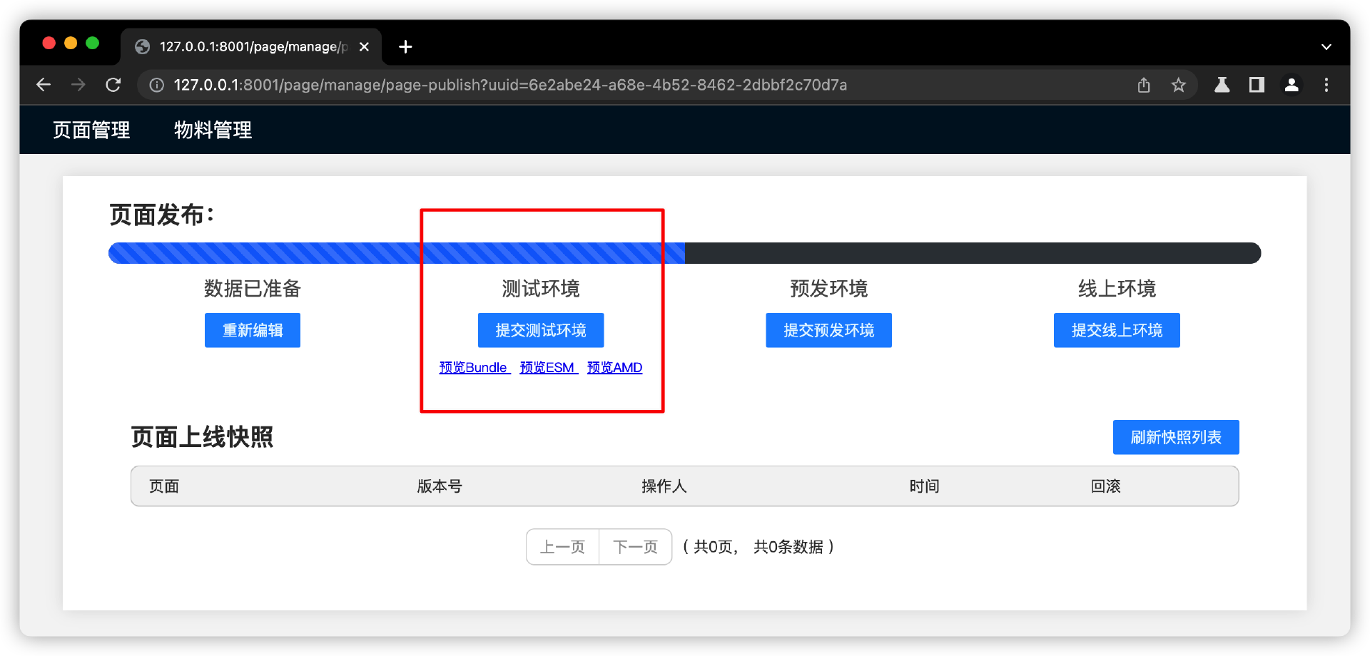 在这个阶段中,用户可以操作触发“待发布的内容”流转到测试环境,把准备阶段的数据转到“测试环境”,同时根据测试环境的页面布局数据,编译测试环境的页面Bundle文件。看课程代码案例截图。