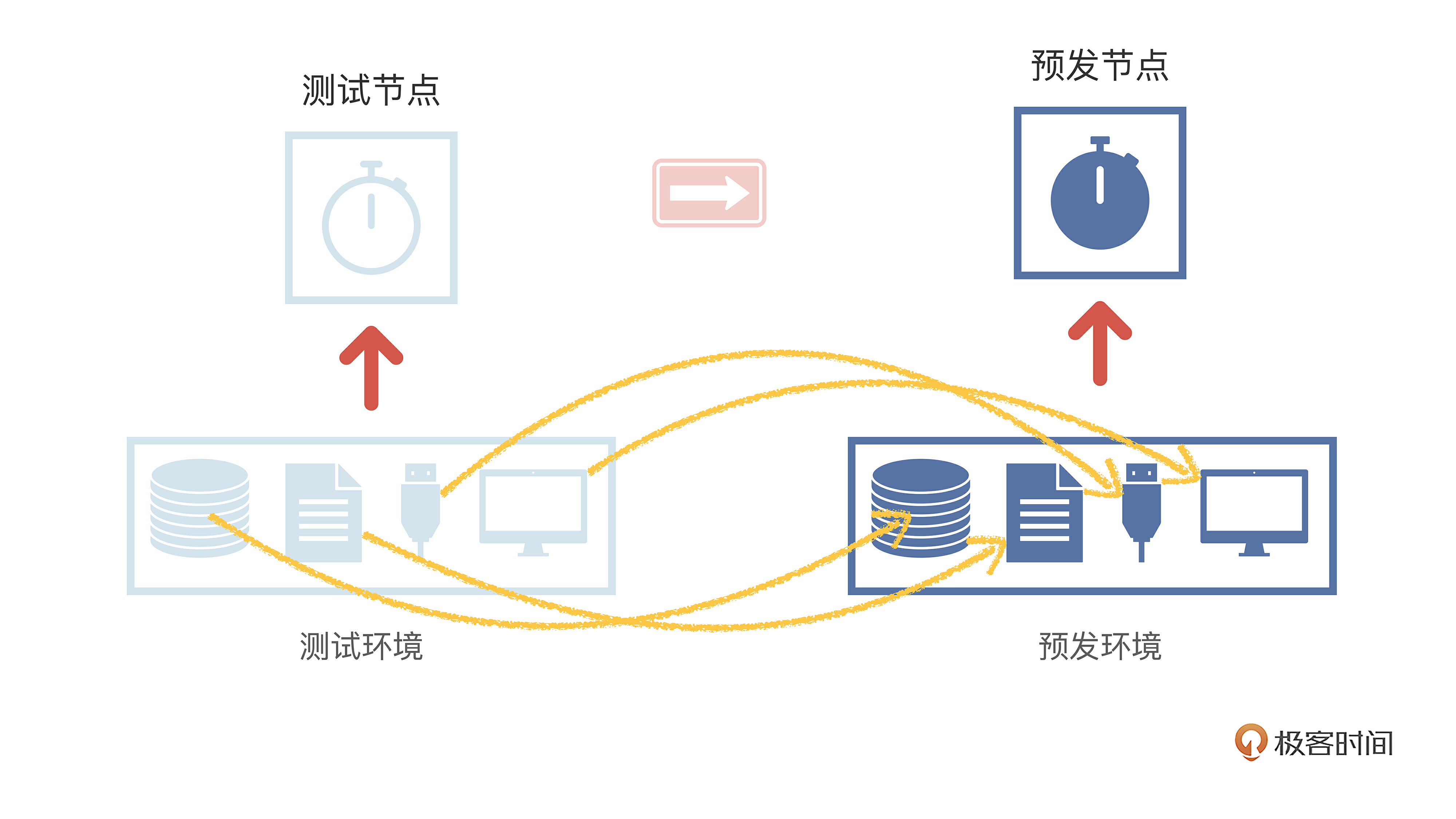 预发布节点,面向的角色是项目经理、产品经理等非开发人员,主要是作为功能验收使用。因为是预备发布上产线的节点,一般称为“预发布节点”,或者简称“预发节点”(在课里我们就统称“预发节点”)。到了这个节点,就不能频繁修改代码或者调整功能了,属于临近发布到产线前的最后一步。