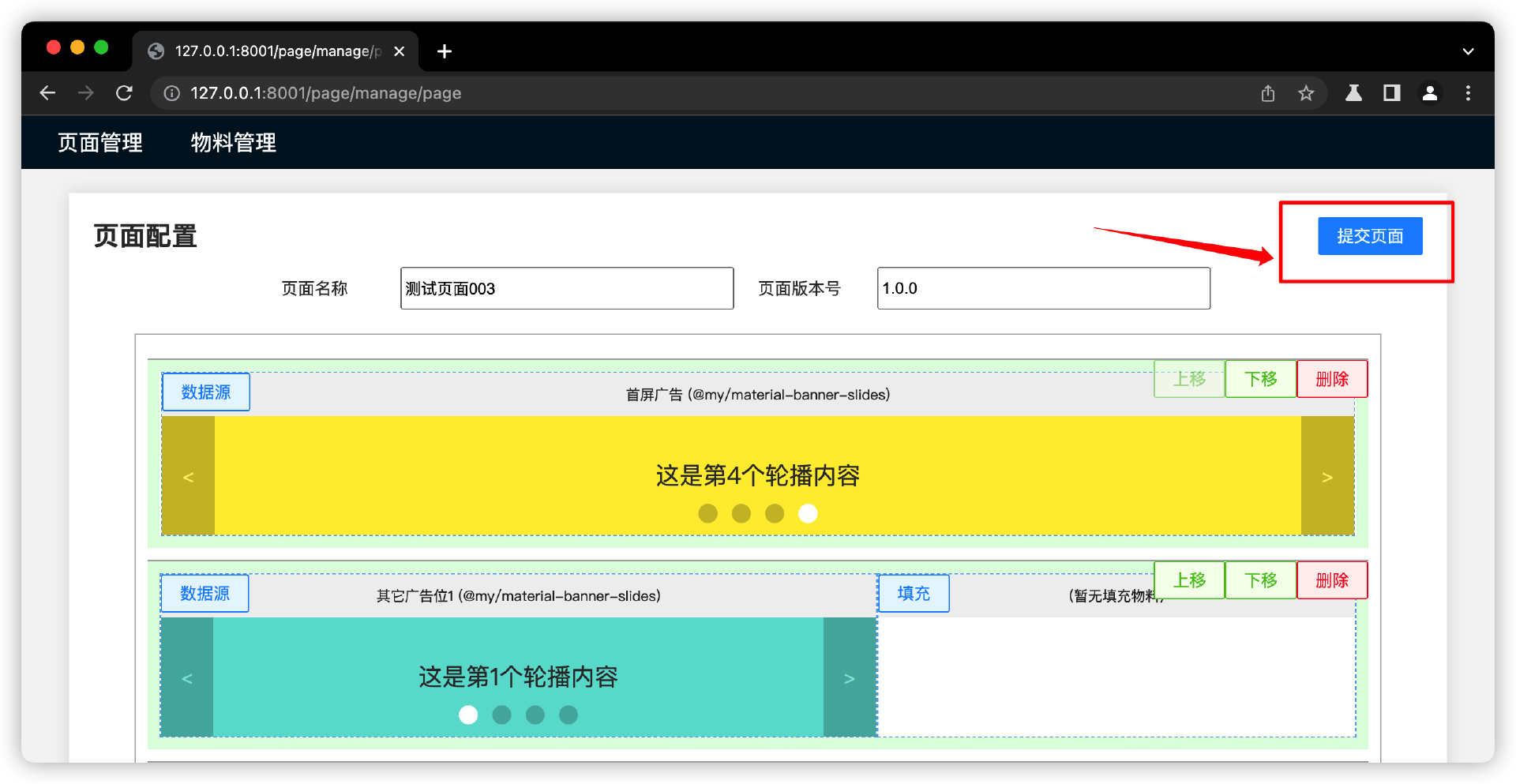 以我们课程的代码案例截图为例。第一张截图是“页面搭建”后,点击“提交页面”,准备进入发布流程。