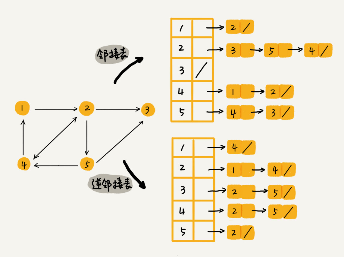 基于此,我们需要一个逆邻接表。邻接表中存储了用户的关注关系,逆邻接表中存储的是用户的被关注关系。对应到图上,邻接表中,每个顶点的链表中,存储的就是这个顶点指向的顶点,逆邻接表中,每个顶点的链表中,存储的是指向这个顶点的顶点。如果要查找某个用户关注了哪些用户,我们可以在邻接表中查找;如果要查找某个用户被哪些用户关注了,我们从逆邻接表中查找。