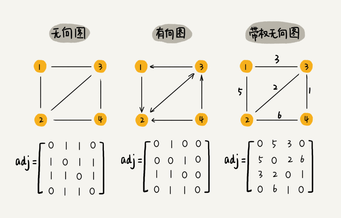 邻接矩阵的底层依赖一个二维数组。对于无向图来说,如果顶点i与顶点j之间有边,我们就将A[i][j]和A[j][i]标记为1;对于有向图来说,如果顶点i到顶点j之间,有一条箭头从顶点i指向顶点j的边,那我们就将A[i][j]标记为1。同理,如果有一条箭头从顶点j指向顶点i的边,我们就将A[j][i]标记为1。对于带权图,数组中就存储相应的权重。